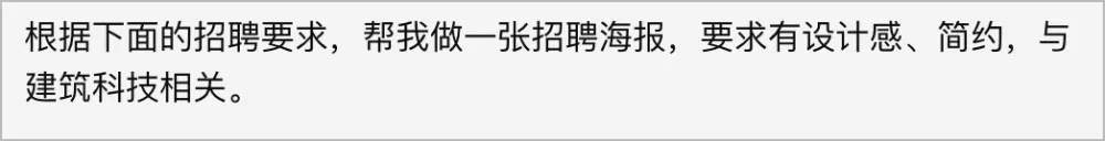 下面这个提示词,就是简单的一句话,要求也是非常粗略的「有设计感、简约、与建筑科技相关。」接着,我直接复制粘贴了进步圈子招聘的一期内容,大概有一千多字。