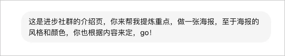 测试的最后,我给他发了一个进步社群的宣传文档,里面有大几千字,也没有很好地提炼重点,而且这次我没有对它提什么风格的要求,就说自己根据内容自己做决定,然后丢了一个二维码给它。