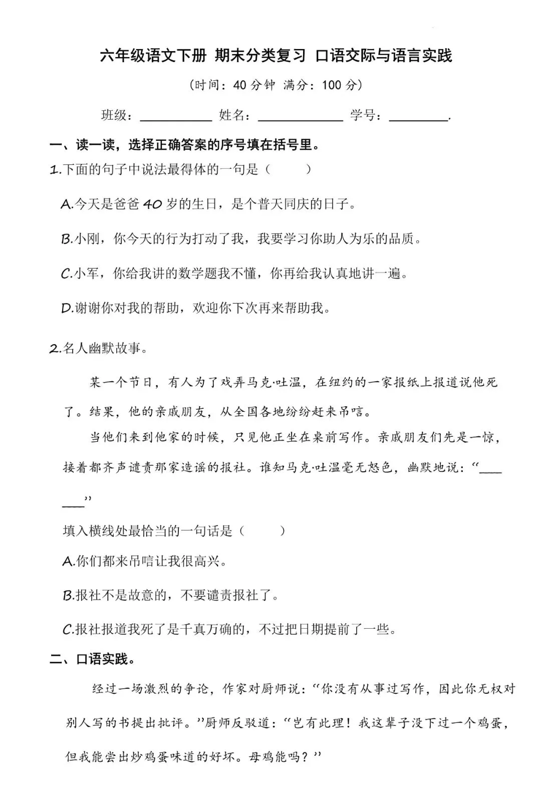 可打印电子版|【部编版】2026六年级语文下册 期末分类复习 口语交际与语言实践 含答案 本文电子版永久链接:https://pan.quark.cn/s/0ffa8e70785a 本文电子版永久链接:https://pan.quark.cn/s/0ffa8e70785a