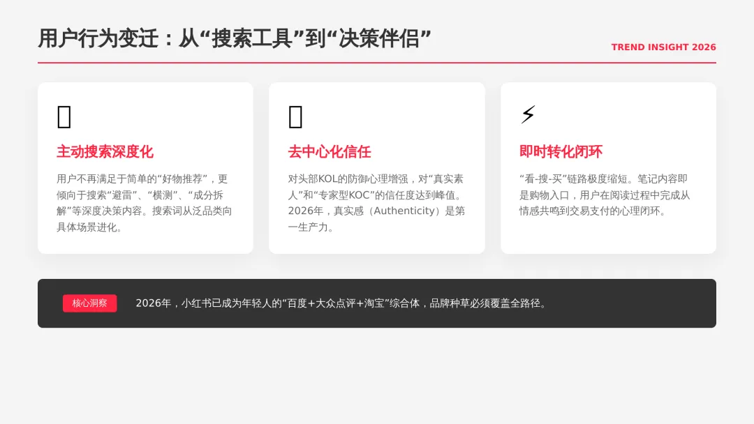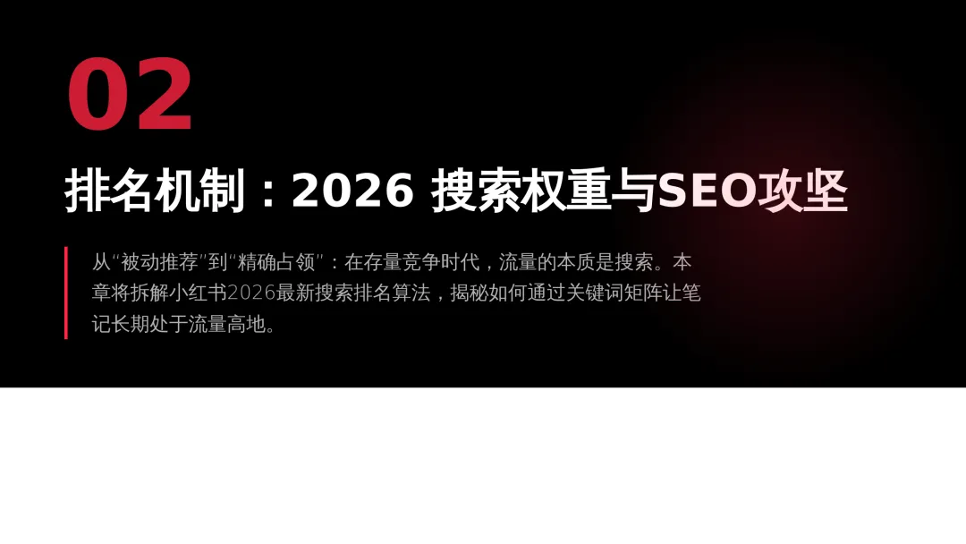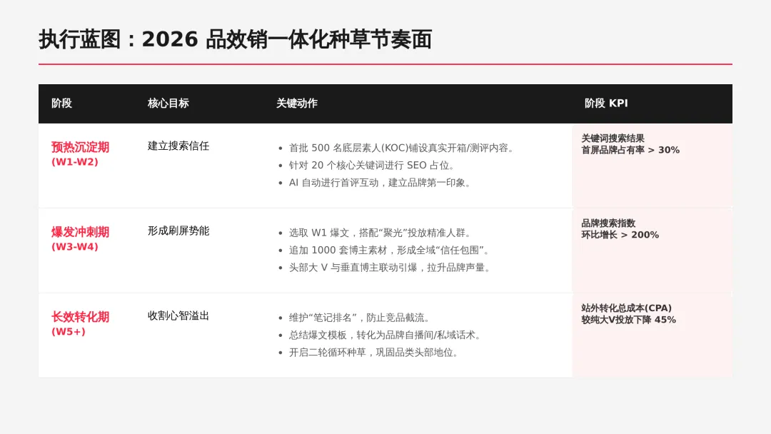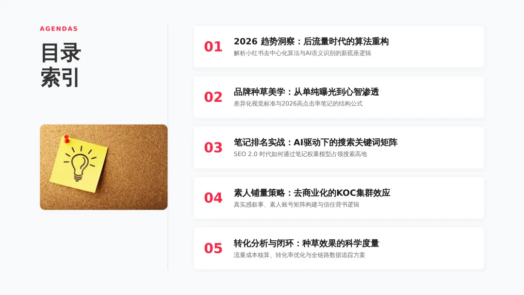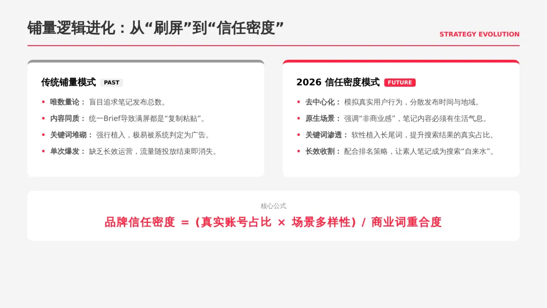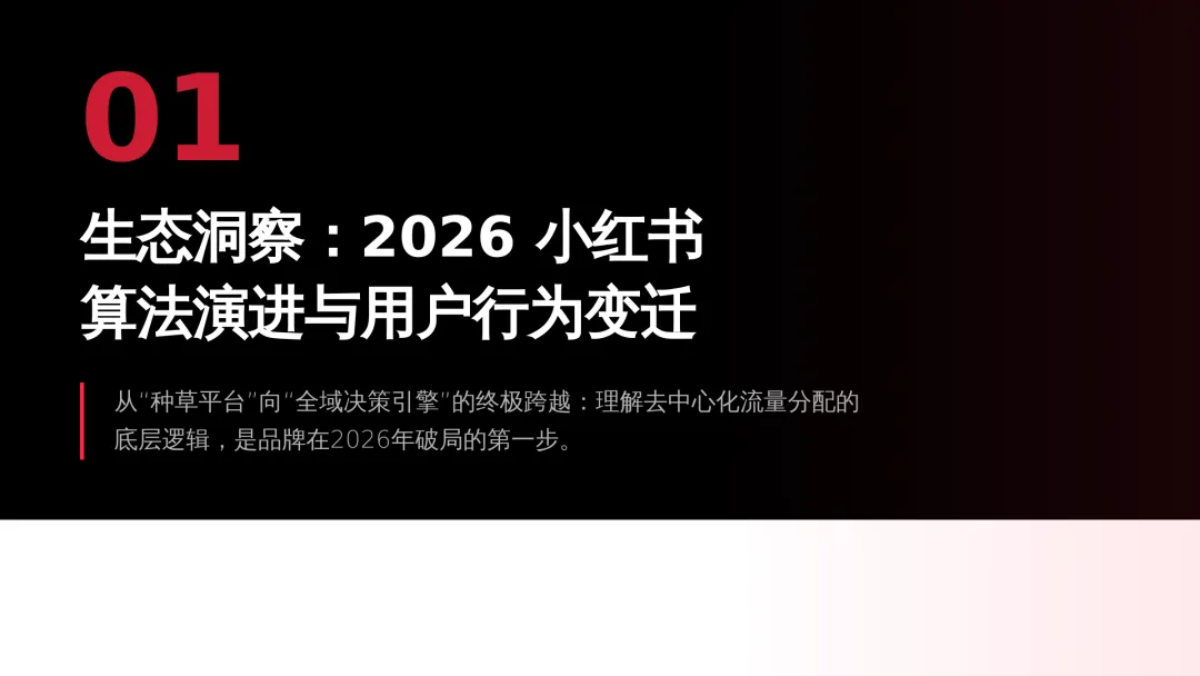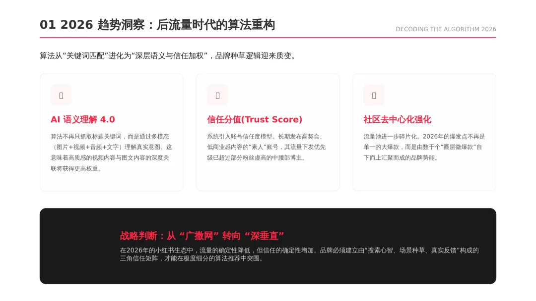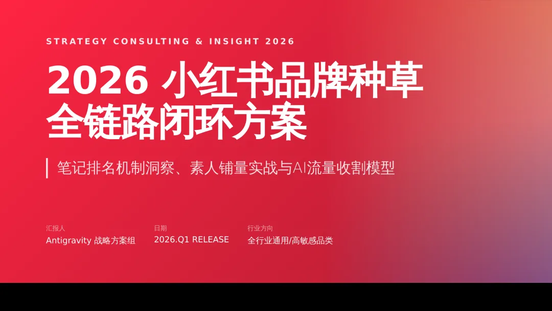 2026小红书品牌种草全链路闭环方案(可下载) —— 文末点击 “阅读原文”下载源文件 —— 2026 年小红书进入信用种草 3.0 时代,算法升级为AI 语义识别 4.0 + 信任分值 + 去中心化,品牌需以KOC 集群素人铺量、SEO 2.0 搜索占位、AI 人机共创内容构建全链路闭环,核心是用真实感提升信任密度,通过搜索心智 – 场景种草 – 真实反馈三角矩阵实现品效销一体化,最终达成长效转化与搜索霸屏。 完整文件左下角点击 “阅读原文” 下载 ▼ 资料库推荐▼ 商业动态: 2026WILL商业大会PPT 丨2026平台营销通案 丨2026营销IP招商通案 丨2026创作者生态报告 丨商业年度特刊《Momentum》丨 2025生活服务行业大会PPT 丨电子书《种草》丨 种收一体策略指南 丨《社区公约2.0》 丨 种草营销新方法论 商业产品:2026商业产品全景手册丨2026搜索推广产品通案丨 2026线索经营产品通案丨2026千帆推广产品营销通案丨薯条产品使用指南 丨2025种草直达产品手册 知识课件:2026做好店播三步走丨运营总监工作模型 丨 入门知识地图 丨 品牌营销五步法 丨 种草训练营 营销IP: 2026小红点计划丨2026美的万千《春日追花2.0》丨《2026小红书宝藏新品年度趋势白皮书》丨2026营销IP特刊《同频》丨2026年度春日盛典2.0丨2026《38好心情小会》招商通案丨2026双旦节点IP招商通案丨长线IP规划《慢人节》丨《夜人节》丨《万物有时节》秋季丨 小美说IP“小美之城” 节点营销: 2026「春上新」商家&买手玩法资料包丨2026「新春市集」行业玩法资料包丨2025节点营销通案 丨 2025年38招商通案 丨 2025双11行业运营专家分享PPT丨 2025双11商家资料包 行业方案: 《2026小红书金融行业白皮书》丨《2026美护情绪洞察白皮书》丨《2026家生活情绪洞察白皮书》丨2026小红书居住趋势丨2026生活服务行业营销日历丨2026运动户外潮流休闲年度营销指南丨2026家装设计行业营销通案丨2026文旅兴趣出游种草指南 丨 2026旅拍行业新春营销攻略 丨2026年汽车行业是重中之重丨 游戏博主成长秘籍丨摄影写真行业爆款笔记制作全揭秘 丨 生态家居行业策略丨三美行业平台营销通案丨2025职业教育行业营销通案 丨2025宠物行业兴趣趋势 案例鉴赏:客资经营实战案例丨海信电视丨OPPO手机丨beU计生用品丨Airbnb爱彼迎丨海尔洗衣机丨生鲜品牌一颗“小时候的番茄”丨户外运动品牌-萨洛蒙