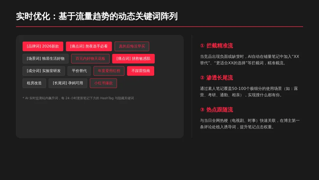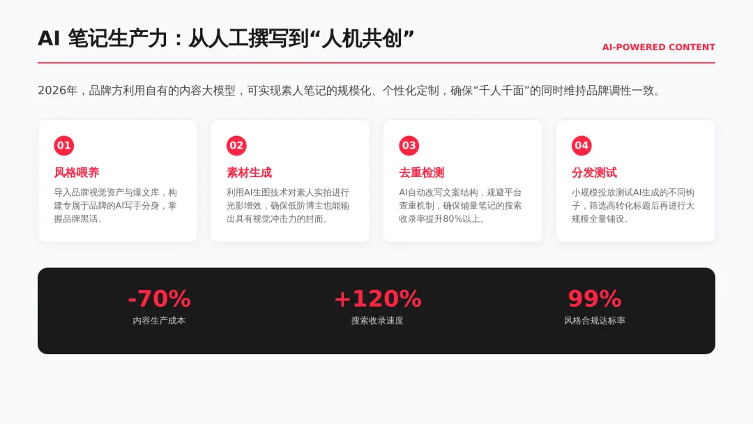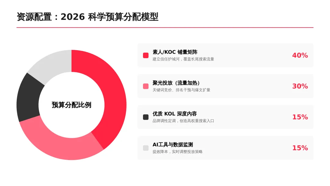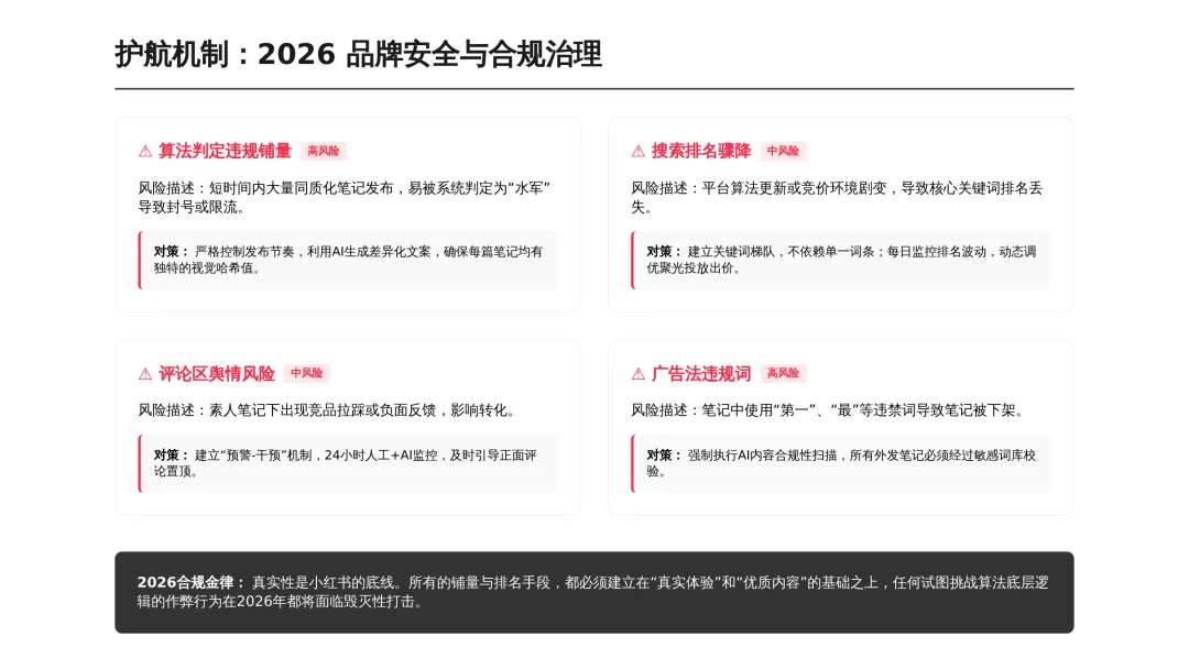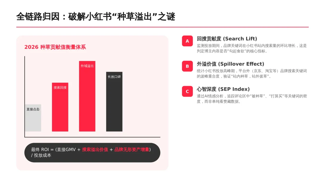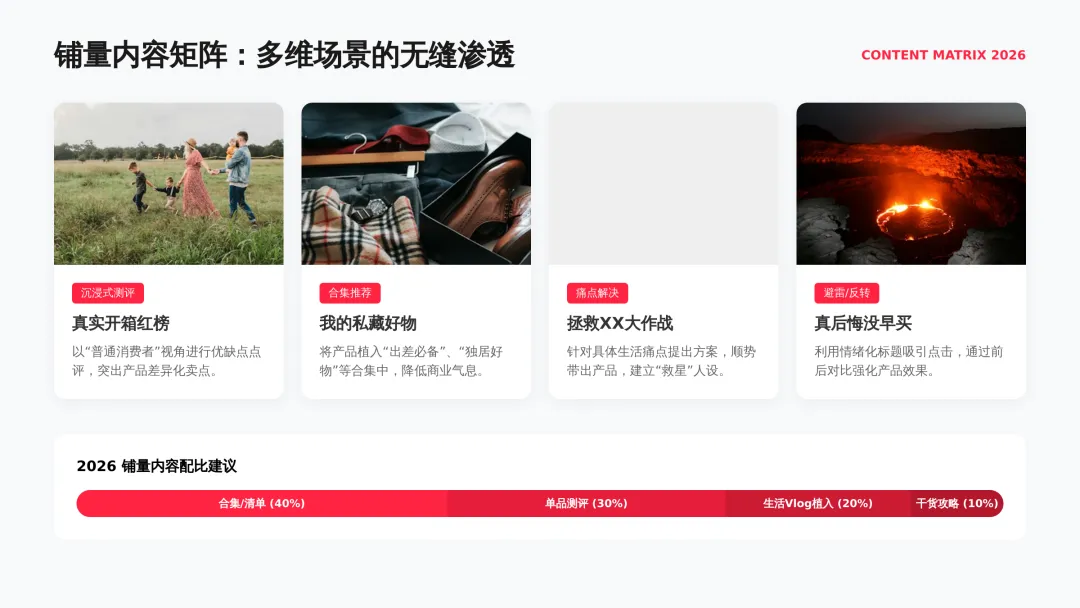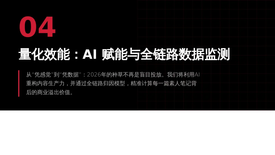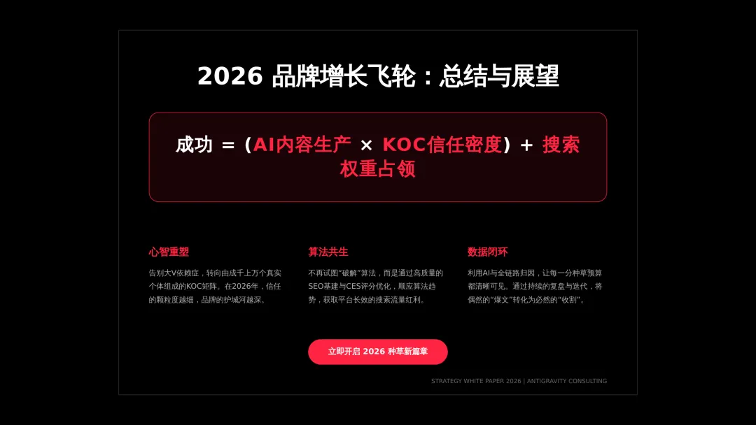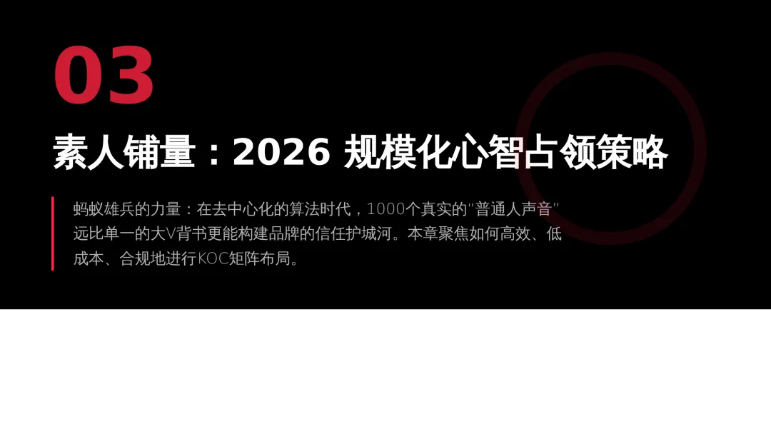 2026小红书品牌种草全链路闭环方案(可下载) —— 文末点击 “阅读原文”下载源文件 —— 2026 年小红书进入信用种草 3.0 时代,算法升级为AI 语义识别 4.0 + 信任分值 + 去中心化,品牌需以KOC 集群素人铺量、SEO 2.0 搜索占位、AI 人机共创内容构建全链路闭环,核心是用真实感提升信任密度,通过搜索心智 – 场景种草 – 真实反馈三角矩阵实现品效销一体化,最终达成长效转化与搜索霸屏。 完整文件左下角点击 “阅读原文” 下载 ▼ 资料库推荐▼ 商业动态: 2026WILL商业大会PPT 丨2026平台营销通案 丨2026营销IP招商通案 丨2026创作者生态报告 丨商业年度特刊《Momentum》丨 2025生活服务行业大会PPT 丨电子书《种草》丨 种收一体策略指南 丨《社区公约2.0》 丨 种草营销新方法论 商业产品:2026商业产品全景手册丨2026搜索推广产品通案丨 2026线索经营产品通案丨2026千帆推广产品营销通案丨薯条产品使用指南 丨2025种草直达产品手册 知识课件:2026做好店播三步走丨运营总监工作模型 丨 入门知识地图 丨 品牌营销五步法 丨 种草训练营 营销IP: 2026小红点计划丨2026美的万千《春日追花2.0》丨《2026小红书宝藏新品年度趋势白皮书》丨2026营销IP特刊《同频》丨2026年度春日盛典2.0丨2026《38好心情小会》招商通案丨2026双旦节点IP招商通案丨长线IP规划《慢人节》丨《夜人节》丨《万物有时节》秋季丨 小美说IP“小美之城” 节点营销: 2026「春上新」商家&买手玩法资料包丨2026「新春市集」行业玩法资料包丨2025节点营销通案 丨 2025年38招商通案 丨 2025双11行业运营专家分享PPT丨 2025双11商家资料包 行业方案: 《2026小红书金融行业白皮书》丨《2026美护情绪洞察白皮书》丨《2026家生活情绪洞察白皮书》丨2026小红书居住趋势丨2026生活服务行业营销日历丨2026运动户外潮流休闲年度营销指南丨2026家装设计行业营销通案丨2026文旅兴趣出游种草指南 丨 2026旅拍行业新春营销攻略 丨2026年汽车行业是重中之重丨 游戏博主成长秘籍丨摄影写真行业爆款笔记制作全揭秘 丨 生态家居行业策略丨三美行业平台营销通案丨2025职业教育行业营销通案 丨2025宠物行业兴趣趋势 案例鉴赏:客资经营实战案例丨海信电视丨OPPO手机丨beU计生用品丨Airbnb爱彼迎丨海尔洗衣机丨生鲜品牌一颗“小时候的番茄”丨户外运动品牌-萨洛蒙