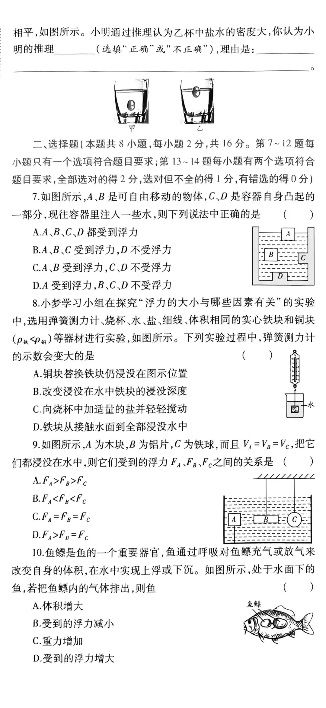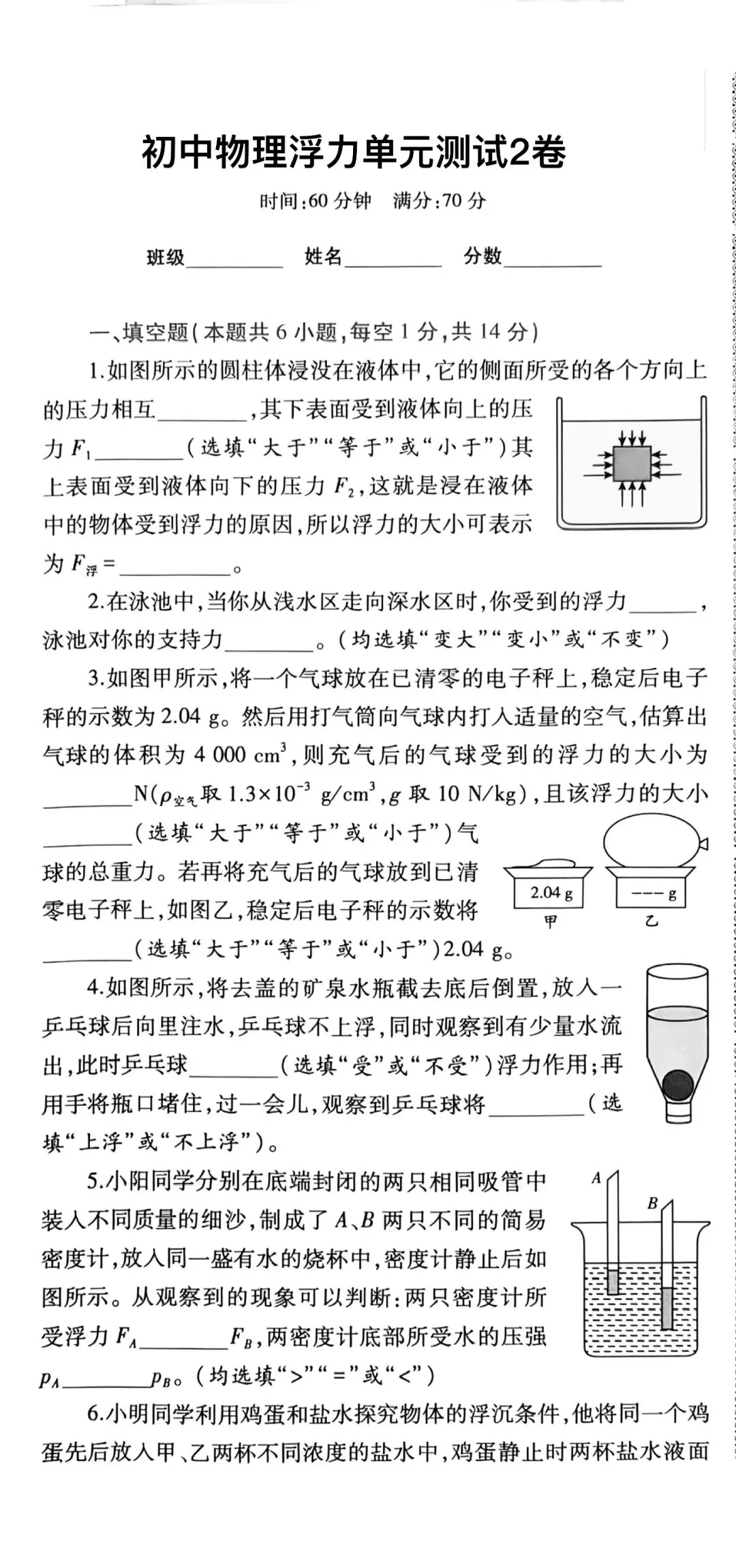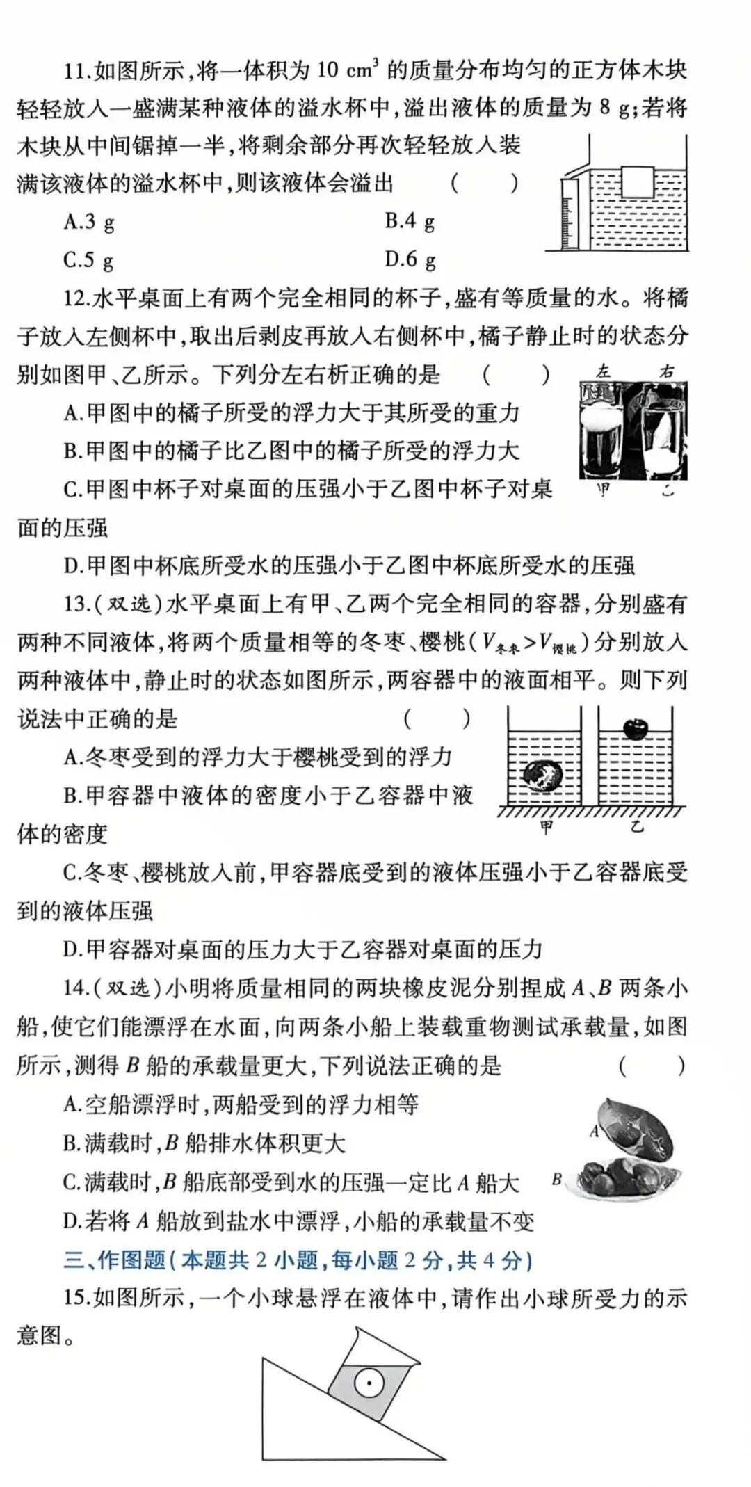 初中物理浮力单元测试2卷高清版(可打印)带答案