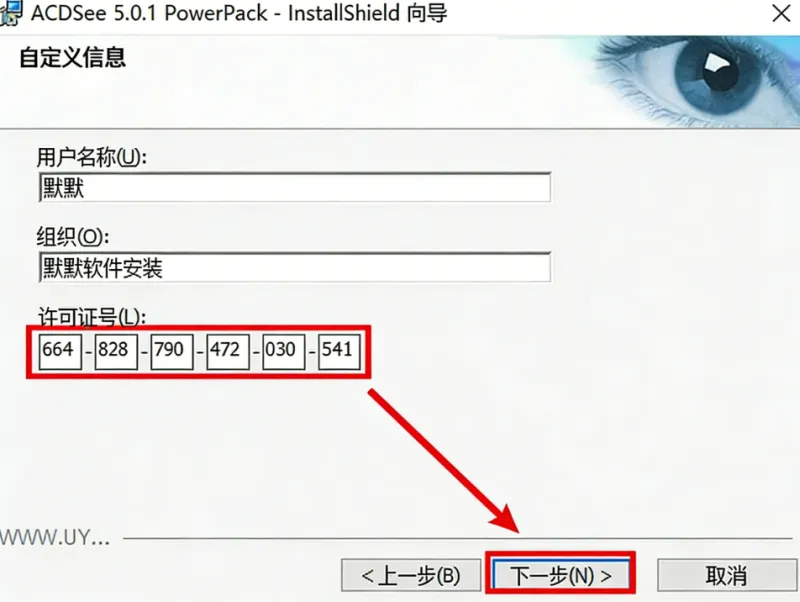 5.用户名称与组织随便填写,许可证号输入:664-828-790-472-030-541,点击“下一步”