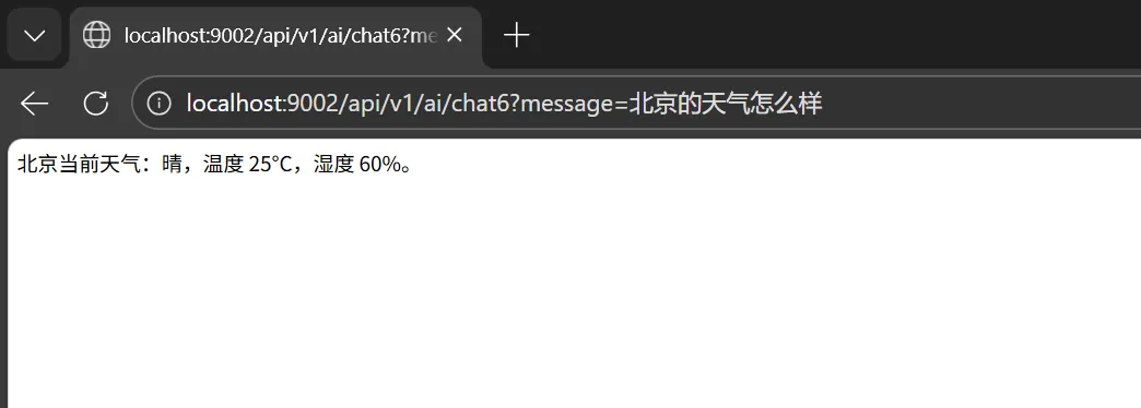 @Componentpublic class WeatherTool {@Tool(description = "查询指定城市的实时天气信息")public String getWeather(@ToolParam(description = "城市名称,例如北京、上海") String city) {return String.format("{\"city\":\"%s\", \"temperature\":\"25C\", \"weather\":\"晴\", \"humidity\":\"60%%\"}",,city);}}