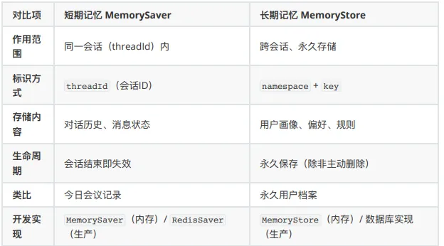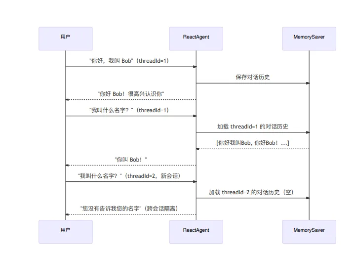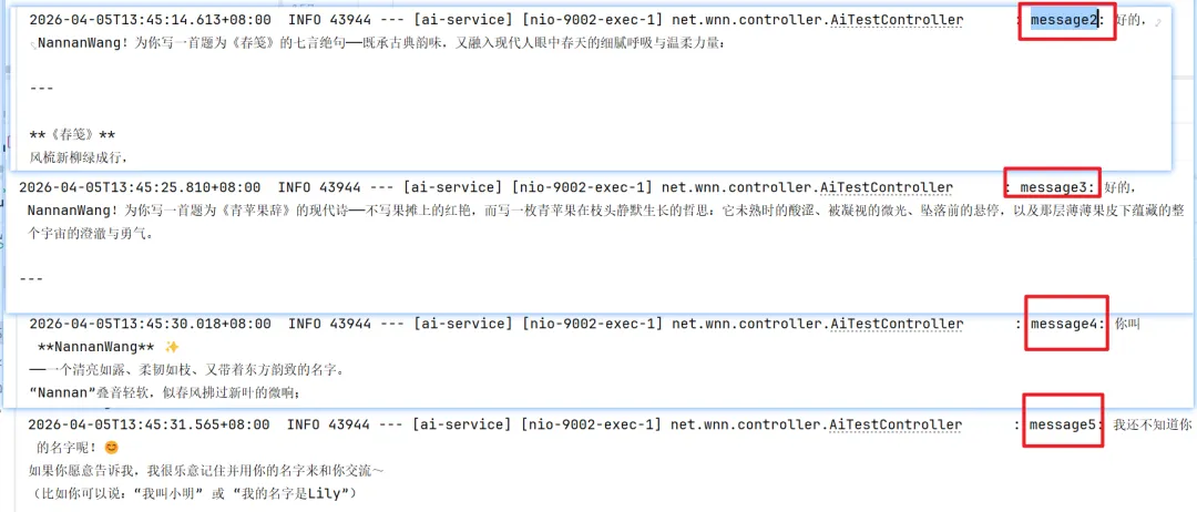 @GetMapping("agent4")public void agent4() throws Exception {ReactAgent reactAgent = ReactAgent.builder().name("个人小助理").model(chatModel).saver(new MemorySaver()) // 开启短期记忆.build();RunnableConfig config = RunnableConfig.builder().threadId("user_1").build();AssistantMessage message1 = reactAgent.call("我的名称叫NannanWang", config);log.info("message1: {}", message1.getText());AssistantMessage message2 = reactAgent.call("写一首关于春天的诗词", config);log.info("message2: {}", message2.getText());AssistantMessage message3 = reactAgent.call("写一首诗关于苹果的", config);log.info("message3: {}", message3.getText());AssistantMessage message4 = reactAgent.call("我叫什么名字", config);log.info("message4: {}", message4.getText());// 模拟另一个用户RunnableConfig config2 = RunnableConfig.builder().threadId("user_2").build();AssistantMessage message5 = reactAgent.call("我叫什么名字", config2);log.info("message5: {}", message5.getText());}