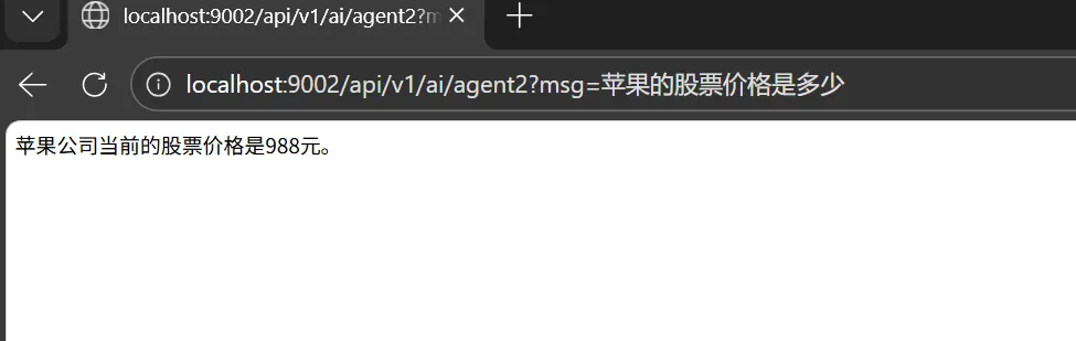 @GetMapping("agent2")public String agent2(@RequestParam String msg) throws Exception {// 创建工具回调(结构化参数)FunctionToolCallback<SearchTool.SearchRequest, String> toolCallback =FunctionToolCallback.builder("search", new SearchTool()).description("搜索工具").inputType(SearchTool.SearchRequest.class).build();ReactAgent reactAgent = ReactAgent.builder().name("测试Agent").model(chatModel).tools(toolCallback).build();AssistantMessage assistantMessage = reactAgent.call(msg);return assistantMessage.getText();}public class SearchTool implements BiFunction<SearchTool.SearchRequest, ToolContext, String> {// 定义结构化请求参数(推荐写法)public record SearchRequest(String query) {}@Overridepublic String apply(SearchRequest request, ToolContext toolContext) {String query = request == null ? "" : request.query();// 返回结构化结果(建议 JSON,这里简化演示)return "搜索结果:" + query + " 股票价格是 988元";}}