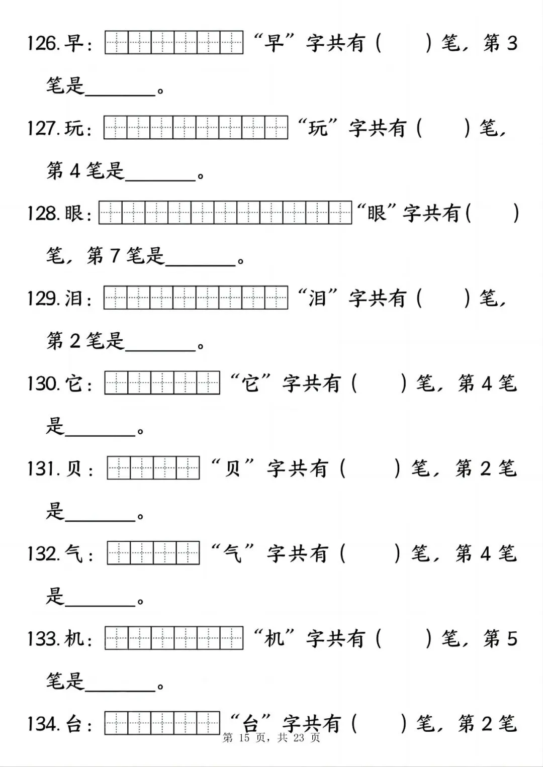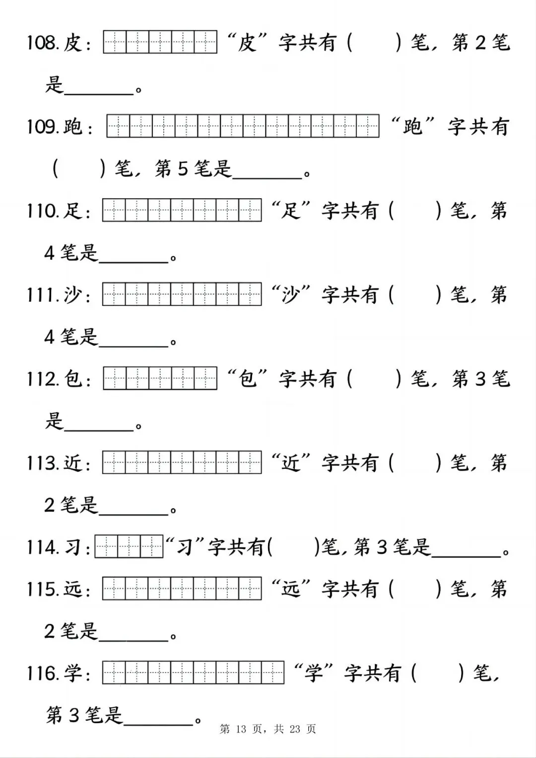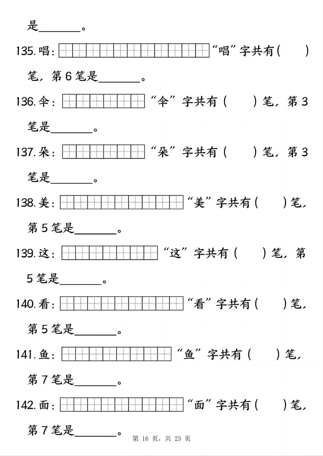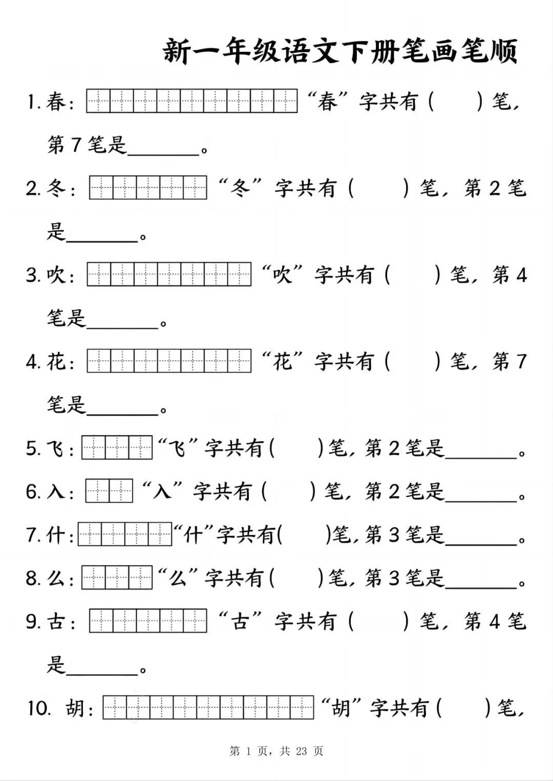 大家好,这里是淘学学资料库,这份《一年级下册语文笔画笔顺专项练习》,完整 pdf 电子档共 23 页。这份资料针对一年级下册全册生字开展笔顺笔画专项训练,逐个列出课本重点汉字的总笔画数与指定笔顺答案,覆盖春、冬、花、飞、青、清、明、阳等高频易错字,题型直接、重点突出,专门解决孩子笔顺写错、笔画数不清的问题。这份专项练习按课文生字顺序系统编排,把最容易写错笔顺的汉字全部整理到位,每字标注总笔画和关键笔形,训练目标明确、练习简洁高效,能快速规范孩子书写习惯,强化笔顺规则记忆,适合课前预习、课后巩固、考前突击查漏,是打好低年级汉字书写基础的必备练习资料。