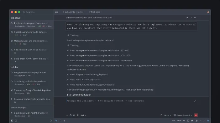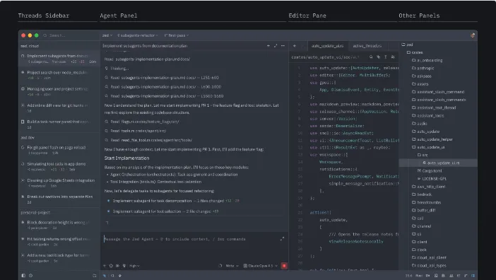 你打开Zed,左边有个Threads Sidebar。你点一下新建线程,选一个AI模型,输入你的任务描述,它就开始跑了。