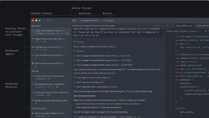今天看到Zed发了一篇博客,标题很直接,”Parallel Agents”。它把这个事给做了。