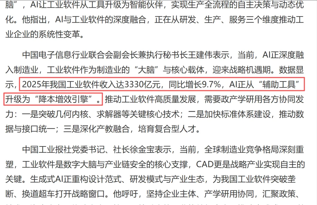 数据也印证了这一点:全球AI工业设计市场2025年为64.5亿美元,预计2026年将增长至83.5亿美元,年复合增长率高达29.5%。2025年我国工业软件收入达3330亿元,同比增长9.7%,AI正从“辅助工具”升级为“降本增效引擎”。