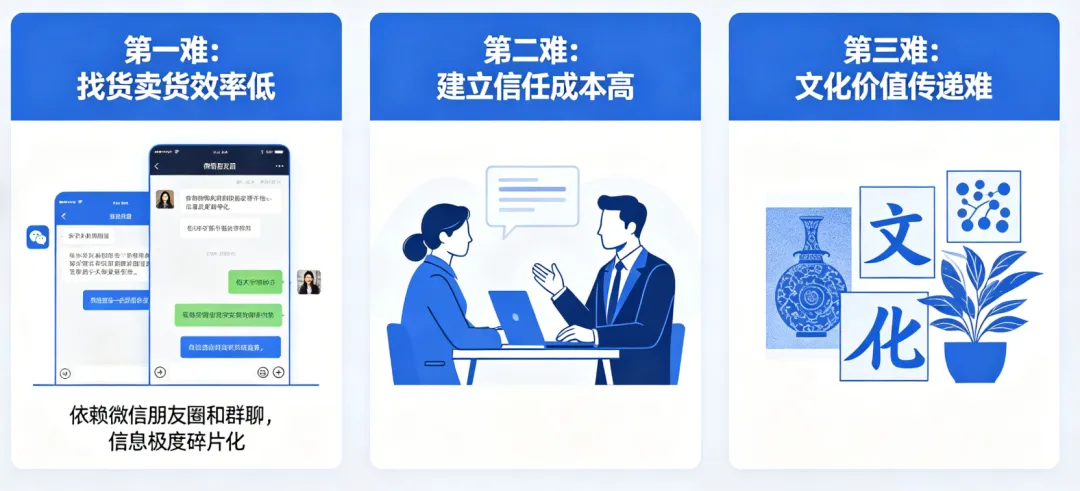 我曾亲眼见到,一位老师为寻一块合适的料子,需要在几十个微信群里不停“爬楼”、刷图,如同大海捞针;一笔谈好的交易,因发货前沟通的细微误会,来回扯皮半天。大家最宝贵的时间与精力,大量消耗在找货、沟通、建立信任这些本该更高效的事情上。这就像在一个顶级商圈里,商户们却还在用最原始的方式记账、揽客。