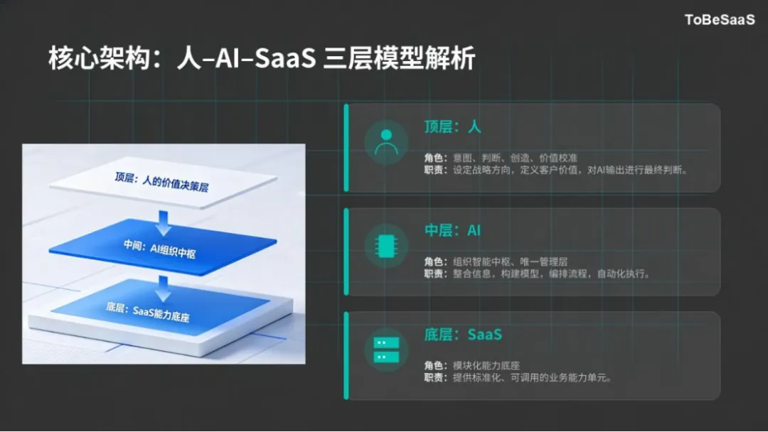 基于以上分析,我们可以得出两个明确的结论:第一,若企业智能层必须以软件形式呈现,那么它绝不仅仅是无招所说的“日抛”,而是会随着企业组织架构的调整、业务需求的迭代,实现“即时性”迭代;第二,中层职能的压缩甚至替代,并非激进的噱头,而是企业智能化转型的必然趋势,是技术发展推动组织升级的必然结果。