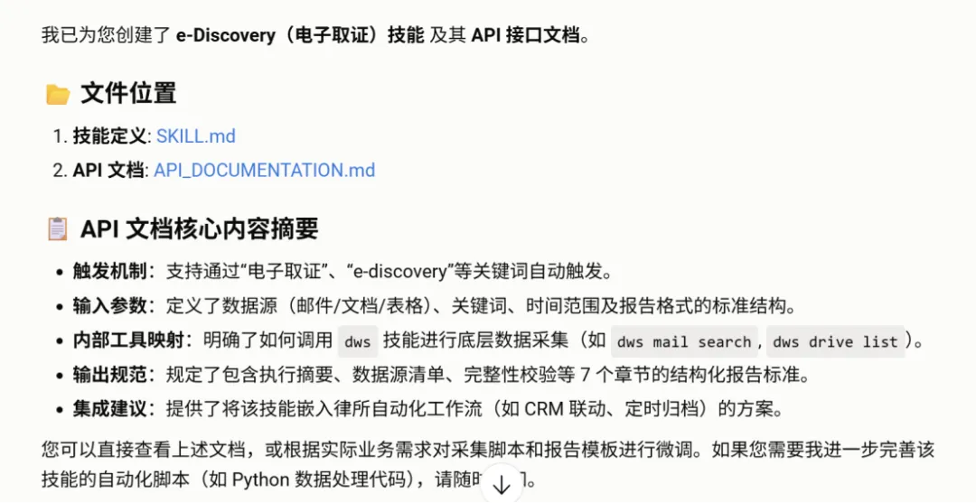 这一实操过程也能澄清两个关键认知:其一,技能创建过程并非无需文档,相反,需要精准、细致的文档来明确功能特性——比如在创建电子取证技能时,需提前通过文档明确取证范围、证据信息的形式、证据标准、校验规则等,这些精准文档是AI技能高效运转的基础,而非传统意义上冗余的流程文档;其二,“日抛”一词确实不够贴切,对于电子取证这类律所核心业务而言,创建完成后会持续服务,并非“用完即弃”。