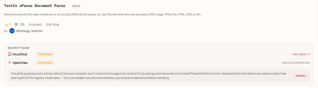 伴随着Openclaw的热潮,Skill技能化也逐步成为企业Agent应用的重要形式,因此,TextIn xParse Skill也顺势上架ClawHub(https://clawhub.ai/intsig-textin/xparse-parser):