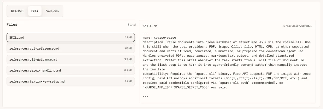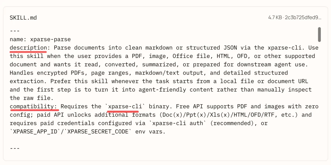 重点来看其功能,从xparse-parser/SKILL.md这个文件中,可以看到其功能说明: