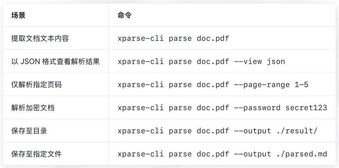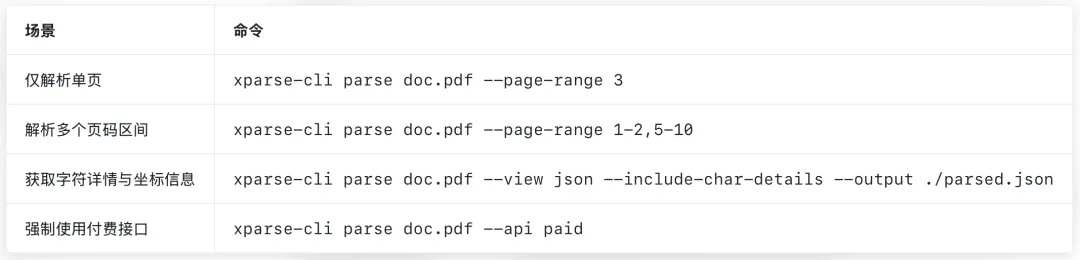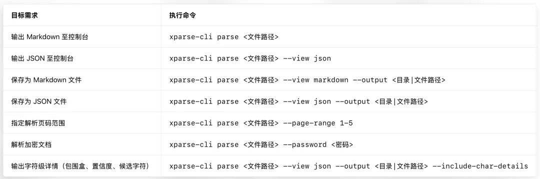 从场景上看,xparse-cli可以直接命令行调用完成输出Markdown/JSON至控制台、保存为Markdown/JSON文件、指定解析页码范围、解析加密文档、输出字符级详情(包围盒、置信度、候选字符)的那个场景。
