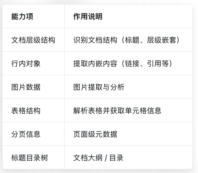 为了实现以上场景功能,会自动启用功能,包括文档层级结构、行内对象、图片数据、表格结构、分页信息、标题树等。
