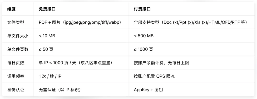 免费版零配置,仅支持PDF+图片,付费版解锁全格式,需配置密钥,优先级上处理本地文档优先用它,失败后再换OCR/Python库等工具。