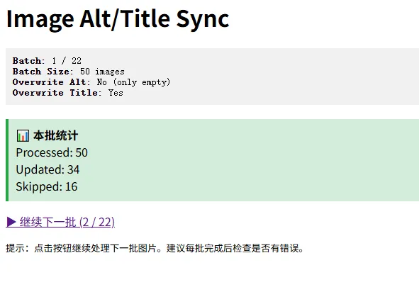 add_action('admin_init', 'my_bulk_update_image_alt_title_from_parent_content');functionmy_bulk_update_image_alt_title_from_parent_content() {// 访问后台并带上这个参数才执行:// /wp-admin/?run_image_meta_sync=1if (!is_admin() || !current_user_can('manage_options') || !isset($_GET['run_image_meta_sync'])) {return;}// ===== 配置区 =====$overwrite_existing_alt = false; // true = 强制覆盖 alt;false = 只改空 alt$overwrite_existing_title = true; // true = 强制覆盖 title;false = 只改空 title$batch_size = 50; // 每批处理50张图片,更稳,避免超时$dry_run = false; // true = 只预览不写入;false = 实际写入// =================// 防止超时@set_time_limit(0);@ignore_user_abort(true);$paged = isset($_GET['img_page']) ? max(1, intval($_GET['img_page'])) : 1;$args = array('post_type' => 'attachment','post_status' => 'inherit','post_mime_type' => 'image','posts_per_page' => $batch_size,'paged' => $paged,'orderby' => 'ID','order' => 'ASC','fields' => 'ids',);$query = new WP_Query($args);$processed = 0;$updated = 0;$skipped = 0;// 输出样式和头部信息echo '<div class="wrap"><h1>Image Alt/Title Sync</h1>';if ($dry_run) {echo '<div style="background:#fff3cd; border-left:4px solid #ffc107; padding:10px; margin:10px 0;">';echo '<strong>⚠️ DRY RUN MODE (预览模式)</strong> - 没有实际写入数据库,只是预览将要进行的更改。<br>';echo '要实际写入,请将代码中的 $dry_run 改为 false。</div>';}echo '<div style="background:#f1f1f1; padding:10px; margin:10px 0; font-family:monospace;">';echo '<strong>Batch:</strong> ' . intval($paged) . ' / ' . intval($query->max_num_pages) . '<br>';echo '<strong>Batch Size:</strong> ' . intval($batch_size) . ' images<br>';echo '<strong>Overwrite Alt:</strong> ' . ($overwrite_existing_alt ? 'Yes' : 'No (only empty)') . '<br>';echo '<strong>Overwrite Title:</strong> ' . ($overwrite_existing_title ? 'Yes' : 'No (only empty)') . '<br>';echo '</div>';if (!empty($query->posts)) {foreach ($query->posts as $attachment_id) {$processed++;$target_title = my_get_best_title_for_attachment($attachment_id);if ($target_title === '') {$skipped++;continue;}$target_title = trim(wp_strip_all_tags($target_title));if ($target_title === '') {$skipped++;continue;}$did_update = false;$changes = array();// 更新 alt$current_alt = get_post_meta($attachment_id, '_wp_attachment_image_alt', true);$alt_was_empty = trim((string) $current_alt) === '';if ($overwrite_existing_alt || $alt_was_empty) {if (!$dry_run) {update_post_meta($attachment_id, '_wp_attachment_image_alt', $target_title);}$did_update = true;if ($alt_was_empty) {$changes[] = 'alt (was empty) → ' . $target_title;} else {$changes[] = 'alt (overwritten) → ' . $target_title;}}// 更新 title(附件 post_title)$attachment_post = get_post($attachment_id);$current_title = $attachment_post ? $attachment_post->post_title : '';$title_was_empty = trim((string) $current_title) === '';if ($overwrite_existing_title || $title_was_empty) {if (!$dry_run) {wp_update_post(array('ID' => $attachment_id,'post_title' => $target_title,));}$did_update = true;if ($title_was_empty) {$changes[] = 'title (was empty) → ' . $target_title;} else {$changes[] = 'title (overwritten) → ' . $target_title;}}if ($did_update) {$updated++;if ($dry_run) {// 预览模式下输出详细信息echo '<div style="font-size:12px; border-bottom:1px solid #eee; padding:2px 0;">';echo 'ID: ' . intval($attachment_id) . ' → ' . esc_html($target_title);if (!empty($changes)) {echo ' (' . esc_html(implode(', ', $changes)) . ')';}echo '</div>';flush();}} else {$skipped++;}}}// 输出结果统计echo '<div style="background:#d4edda; border-left:4px solid #28a745; padding:10px; margin:20px 0 10px 0;">';echo '<strong>📊 本批统计</strong><br>';echo 'Processed: ' . intval($processed) . '<br>';echo 'Updated: ' . intval($updated) . '<br>';echo 'Skipped: ' . intval($skipped) . '<br>';echo '</div>';// 下一页继续跑if ($paged < $query->max_num_pages) {$next_page_url = add_query_arg(array('run_image_meta_sync' => 1,'img_page' => $paged + 1,), admin_url());echo '<p><a class="button button-primary" href="' . esc_url($next_page_url) . '">▶ 继续下一批 (' . intval($paged + 1) . ' / ' . intval($query->max_num_pages) . ')</a></p>';echo '<p><small>提示:点击按钮继续处理下一批图片。建议每批完成后检查是否有错误。</small></p>';} else {echo '<div style="background:#cce5ff; border-left:4px solid #004085; padding:10px; margin:20px 0 10px 0;">';echo '<strong>✅ 全部完成!</strong><br>';echo '所有批次已处理完毕。<br>';echo '如需重新运行,请再次访问此页面。</div>';echo '<p><a class="button button-secondary" href="' . esc_url(admin_url()) . '">返回后台首页</a></p>';}echo '</div>';exit;}/*** 为附件找最合适的标题来源:* 1. 附件父级 post_parent* 2. WooCommerce 产品特色图* 3. WooCommerce 产品相册图* 4. 普通文章/页面特色图*/functionmy_get_best_title_for_attachment($attachment_id) {$attachment_id = intval($attachment_id);if (!$attachment_id) {return '';}// 1) 优先用附件父级$attachment = get_post($attachment_id);if ($attachment && !empty($attachment->post_parent)) {$parent_id = intval($attachment->post_parent);$parent = get_post($parent_id);if ($parent && in_array($parent->post_type, array('product', 'post', 'page'), true)) {$title = get_the_title($parent_id);if (!empty($title)) {return $title;}}}global $wpdb;// 2) WooCommerce 产品特色图$product_featured_id = $wpdb->get_var($wpdb->prepare("SELECT p.IDFROM {$wpdb->posts} pINNER JOIN {$wpdb->postmeta} pm ON p.ID = pm.post_idWHERE p.post_type = 'product'AND p.post_status IN ('publish', 'private', 'draft')AND pm.meta_key = '_thumbnail_id'AND pm.meta_value = %dLIMIT 1", $attachment_id));if ($product_featured_id) {$title = get_the_title($product_featured_id);if (!empty($title)) {return $title;}}// 3) WooCommerce 产品相册图$gallery_product_id = $wpdb->get_var($wpdb->pr