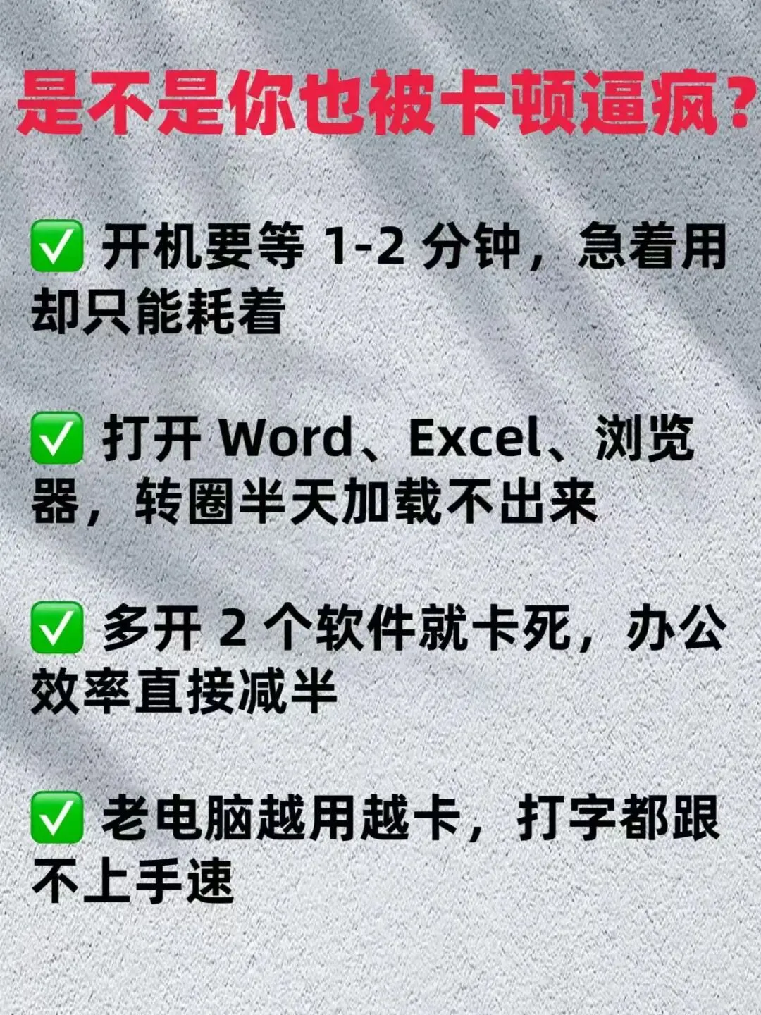 很多人以为电脑卡顿是 “老了”“性能不行”,其实大多是这 3 个问题在作祟,找准根源才能对症下药: