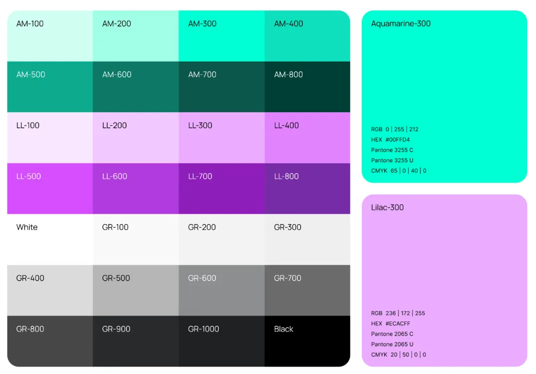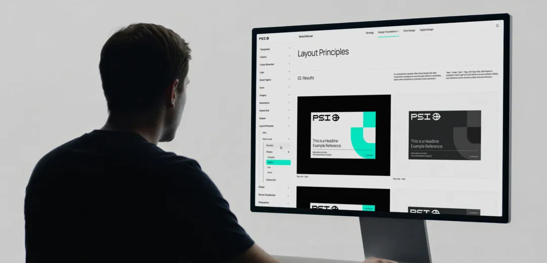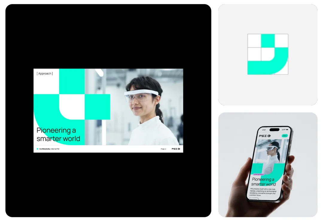 色彩方案的更迭同样意义深远。PSI 果断放弃了此前的绿色系,转而采用以深灰色和白色为主色的现代调色盘。最为醒目的是新增的主色调“海蓝色”,它代表了商业技术与可持续发展的平衡,强化了品牌稳定与负责任的形象。辅以充满活力的淡紫色,整体视觉系统更加灵动且具有冲击力。