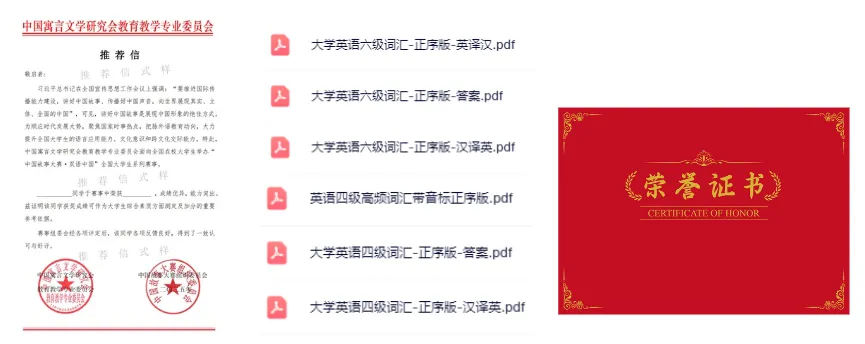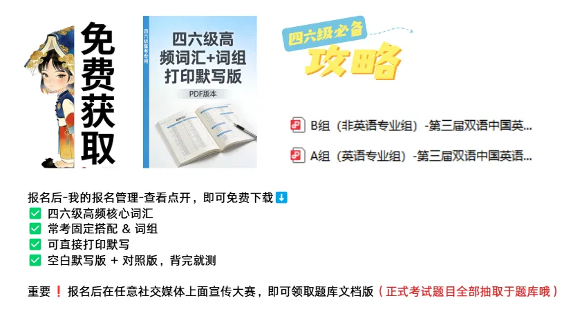福利丰厚,人人有收获:凡参赛均可获得纸质版获奖证书,更有一等奖前20名专属盖章推荐信、精美证书外壳等惊喜福利;报名即可领取四六级高频词汇+词组+打印默写pdf,备赛、备考四六级一举两得。