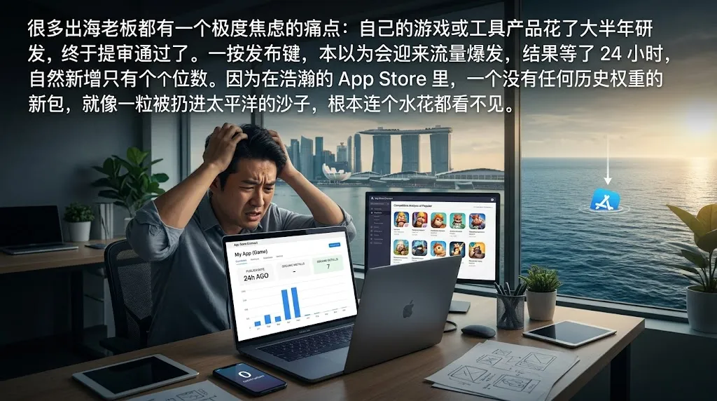 很多出海老板都有一个极度焦虑的痛点:自己的游戏或工具产品花了大半年研发,终于提审通过了。一按发布键,本以为会迎来流量爆发,结果等了 24 小时,自然新增只有个位数。因为在浩瀚的 App Store 里,一个没有任何历史权重的新包,就像一粒被扔进太平洋的沙子,根本连个水花都看不见。