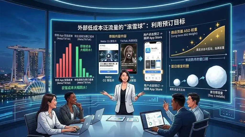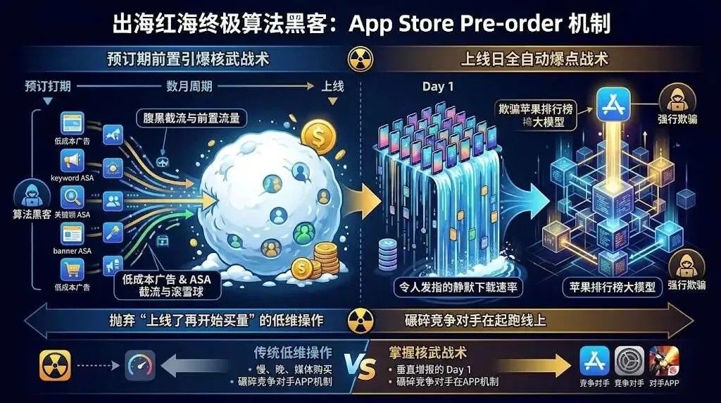 在出海红海中,绝不要打毫无准备的“遭遇战”。App Store Pre-order 机制是将单点爆发力拉长到数月周期的终极算法黑客。抛弃“上线了再开始买量”的低维操作;在预订期用低成本广告和 ASA 进行极度腹黑的截流与滚雪球;最终利用首日的全自动静默下载,制造令人发指的下载速率,强行欺骗苹果的排行榜大模型。掌握了这套前置引爆的核武战术,你就能不费吹灰之力,将竞争对手碾碎在首发的起跑线上!