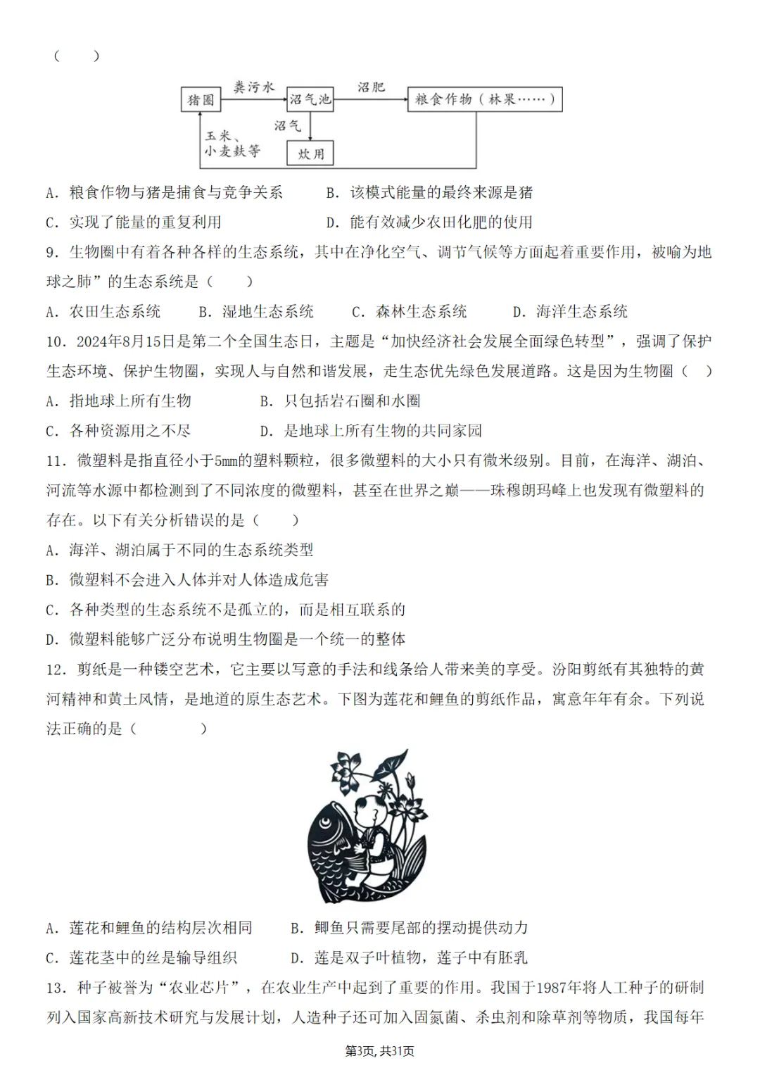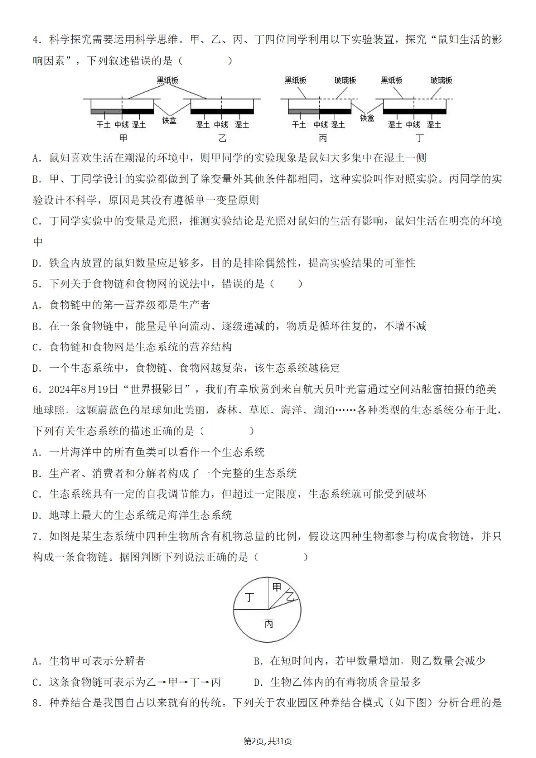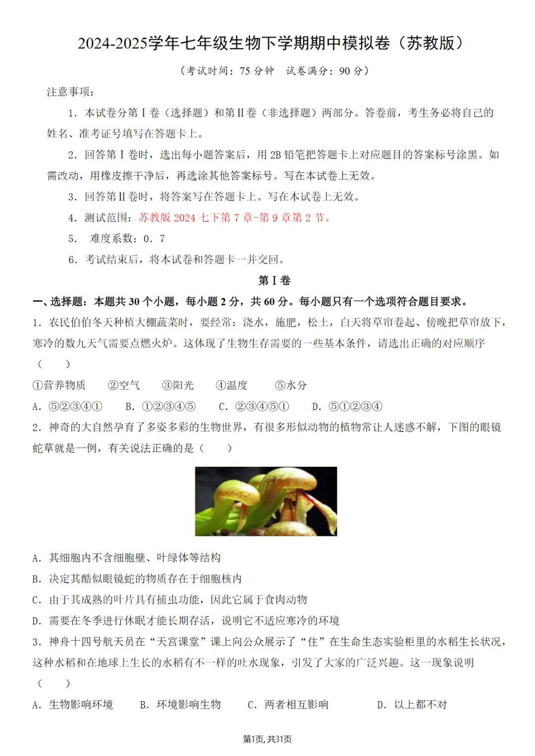 【免费下载】七年级(下)生物 期中模拟卷(苏教版)可打印,PDF电子版