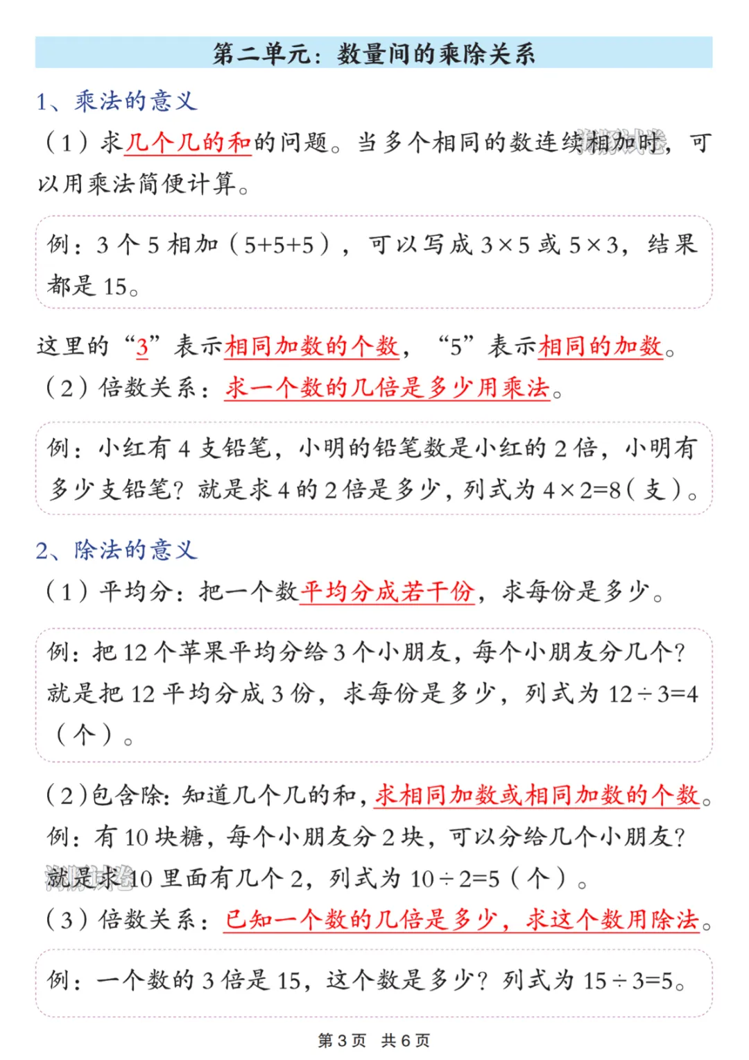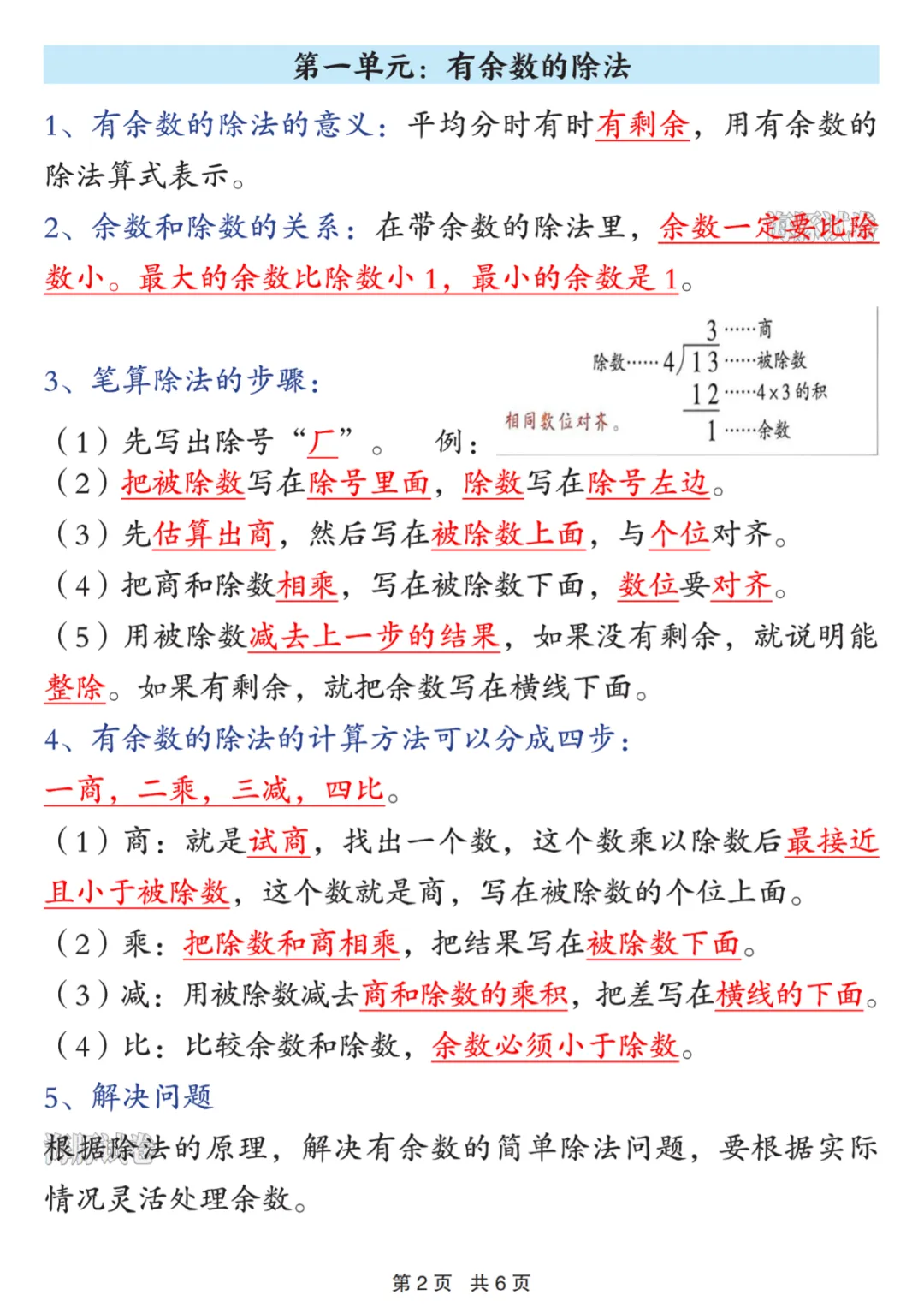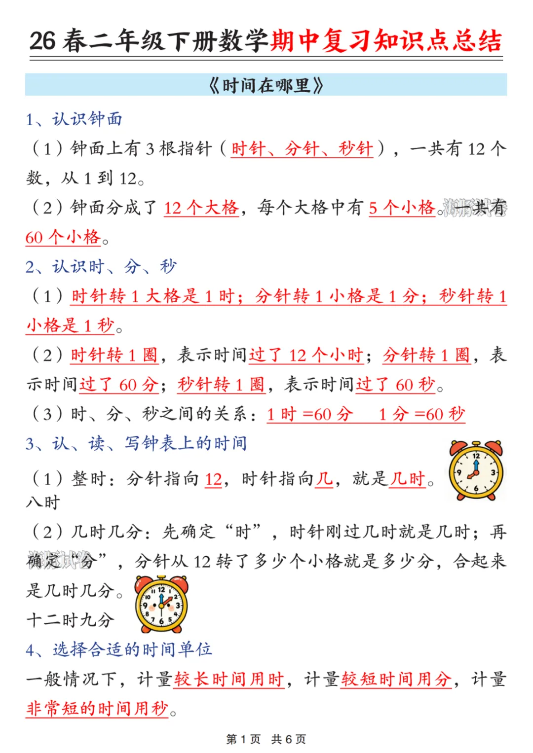 【免费下载】二年级(下)数学期中复习知识点总结可打印,PDF电子版
