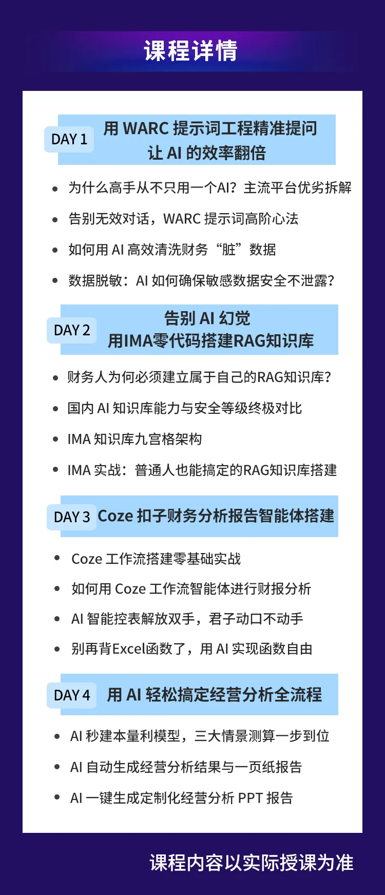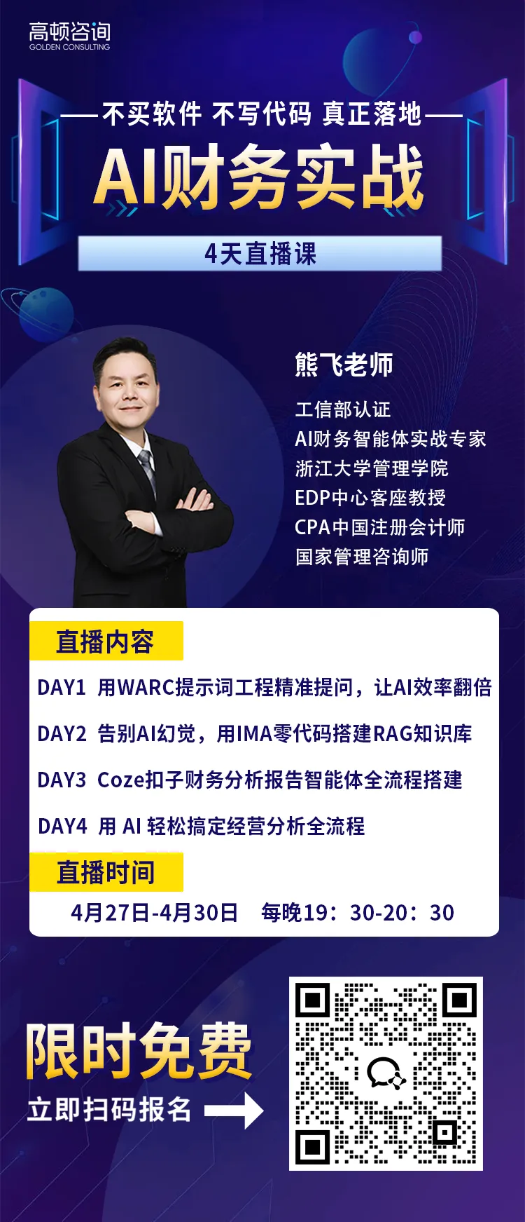 如果你希望了解如何将AI工具应用于财税工作,不妨趁现在,跟随一位既懂财税、也懂AI的老师,系统学习相关方法。大家可以来听下熊飞老师的4天直播课,学习如何将AI运用到财务的实际工作中,现在报名免费,扫描下方二维码即可报名👇👇