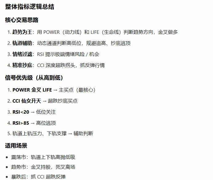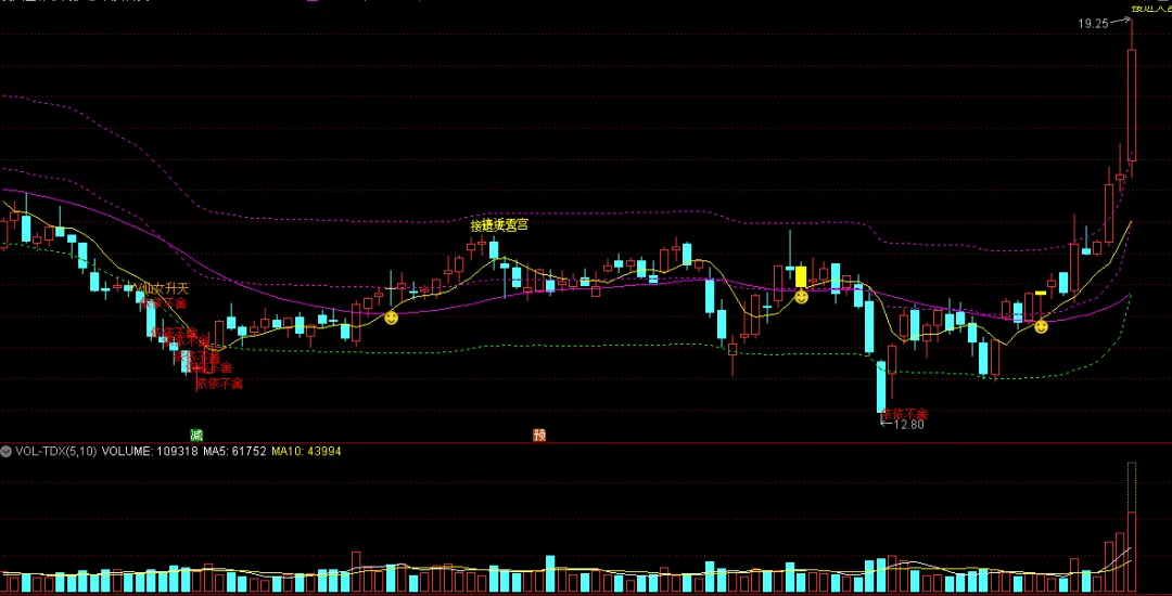 DOTLINEVAR4:=EMA(LOW,3);VAR5:=EMA(LOW,10);VAR6:=EMA(LOW,20);VAR7:=EMA(LOW,30);VAR8:=EMA((VAR5 + VAR6 + VAR7) * 0.28,18);VAR9:=EMA(HIGH,10);VAR10:=EMA(HIGH,20);VAR11:=EMA(HIGH,30);VAR12:=EMA((VAR9 + VAR10 + VAR11) * 0.382,18);POWER:REF(EMA((2 * CLOSE + HIGH + LOW + OPEN)/5,5),1),COLORYELLOW;VAR13:=EMA((VAR9 + VAR10 + VAR11) * 0.382,10);VAR14:=EMA((VAR5 + VAR6 + VAR7) * 0.28,10);LIFE:(VAR13 + VAR14)/2,COLORMAGENTA;BU:=CROSS(POWER,LIFE);STICKLINE(BU,OPEN,CLOSE,3.2,0),COLORYELLOW;VIVIAN:DRAWICON(CROSS(POWER,LIFE),POWER,5);FF:=ABS((2*CLOSE+HIGH+LOW)/4-MA(CLOSE,20))/MA(CLOSE,20);DD:=DMA(CLOSE,FF);上:(1+7/100)*DD,DOTLINE,COLORMAGENTA;下:(1-7/100)*DD,DOTLINE,COLORGREEN;中:(上+下)/2,DOTLINE,COLORMAGENTA;DRAWTEXT(“RSI.RSI1”>85,H*1.01,’接近天宫’),COLORYELLOW;DRAWTEXT(“RSI.RSI1″<20,L*1.01,’依依不舍’),COLORRED;TYP:=(HIGH+LOW+CLOSE)/3;CCI:=(TYP-MA(TYP,14))/(0.015*AVEDEV(TYP,14));YQ:=EVERY(CCI<-100,4) AND CCI>REF(CCI,4) AND C<REF(O,4) AND CCI>-120;DRAWTEXT(YQ,L*1.01,’VV仙女升天’),COLOR0099FF; |