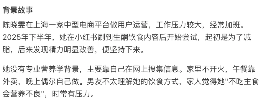 「一个31岁、在上海工作的女性,久坐办公室,最近两年体重一直在涨,试过好几次节食但都没坚持下来,朋友推荐她了解生酮饮食,但不知道怎么开始……」