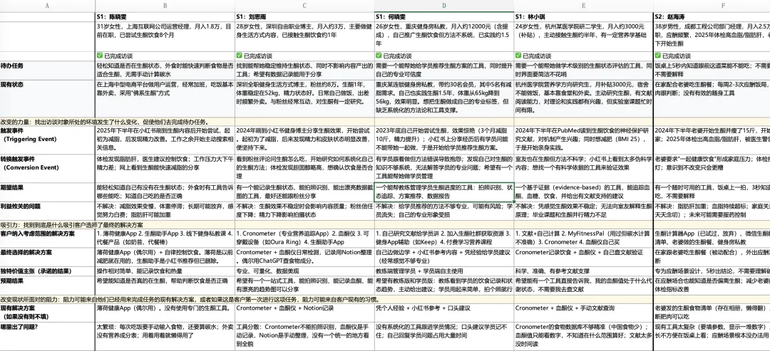 20遍跑完之后,我会让AI把所有访谈结果,整理成Excel格式:每一行是一个受访者,每一列是一个问题,清清楚楚。