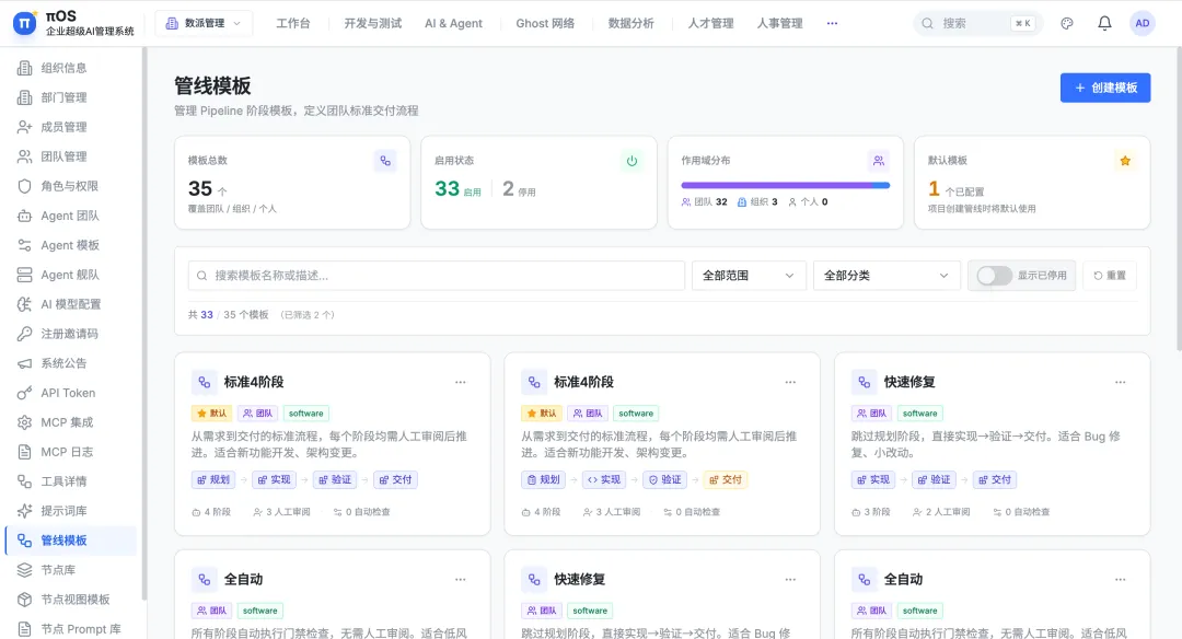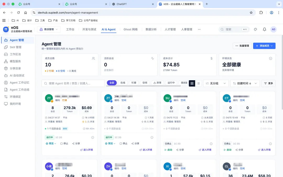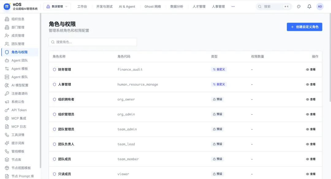 云南数派数据科技有限公司专注于企业级AI平台研发。旗下核心产品πOS(Enterprise Hybrid Workforce Operating System)是一套人机混合工作操作系统,致力于帮助企业建立AI Agent的组织化管理与协作能力。目前系统已具备完整的线上运行环境,覆盖软件生产、人才管理、资产沉淀等多个业务域。