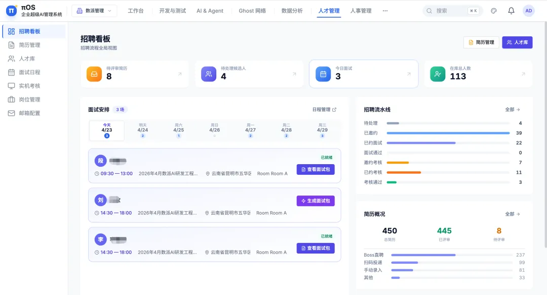 政策点名“发展求职招聘大模型”。πOS的人才管理模块已覆盖简历筛选、AI评审到实机考核的完整链路,累计处理多批次简历评审,并在沙箱环境中实现了”成果+过程”的双维度评估。