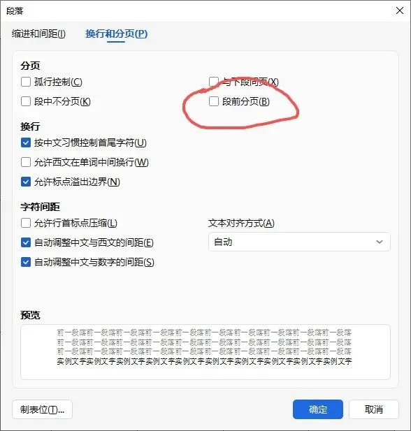 3. 调整分页选项:在段落设置窗口中,切换到“换行与分页”选项卡,取消“段前分页”的勾选,点击确定。