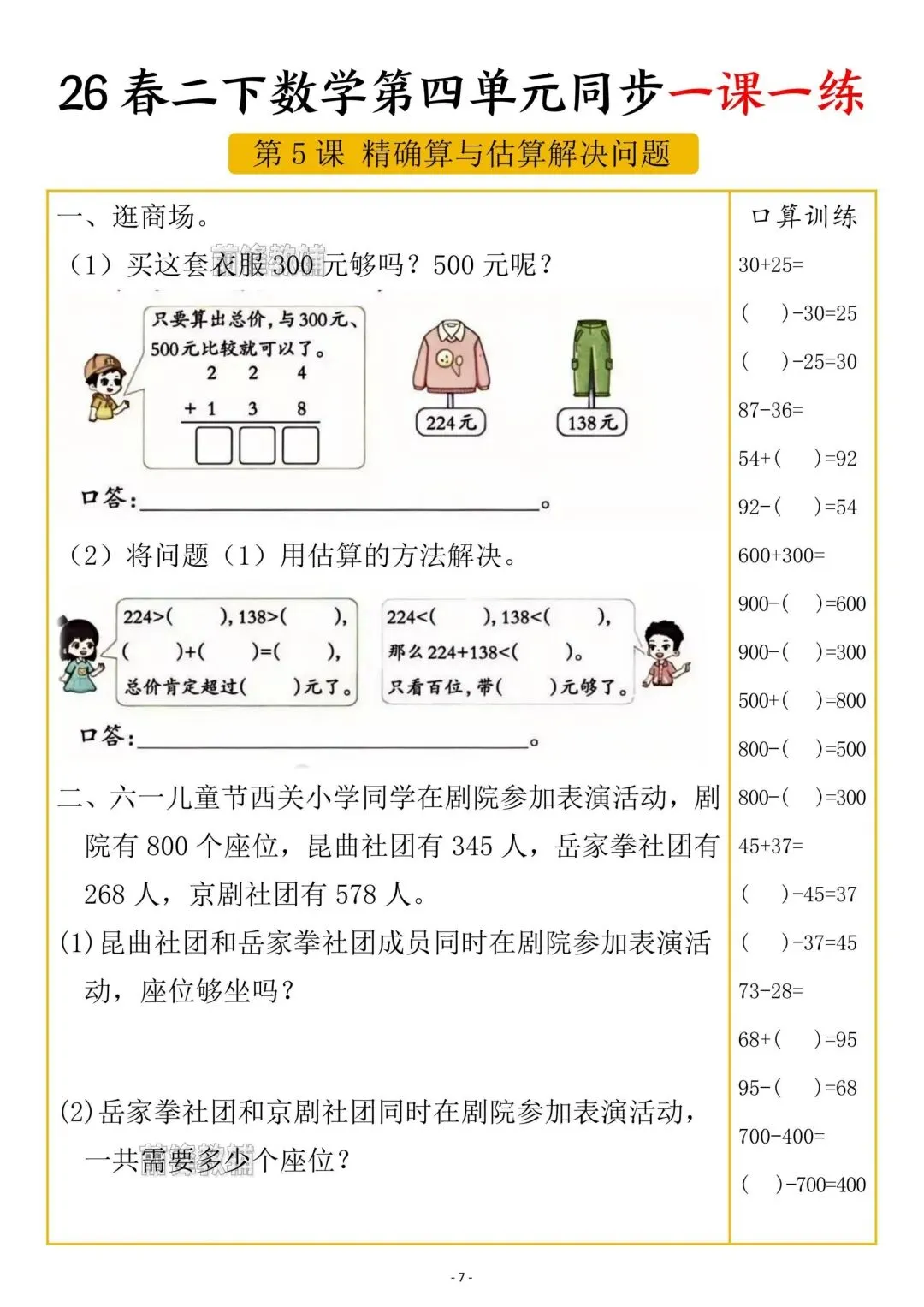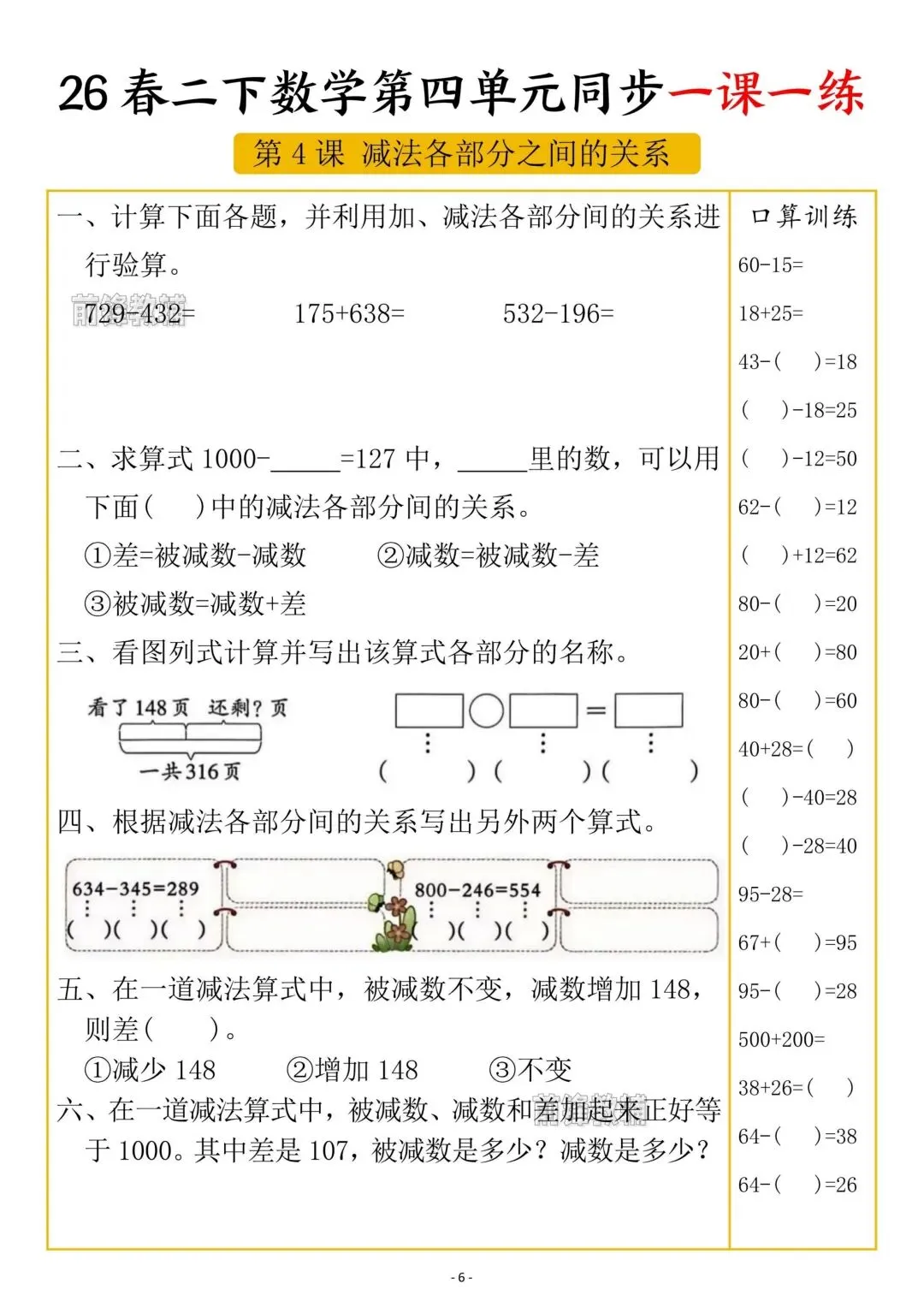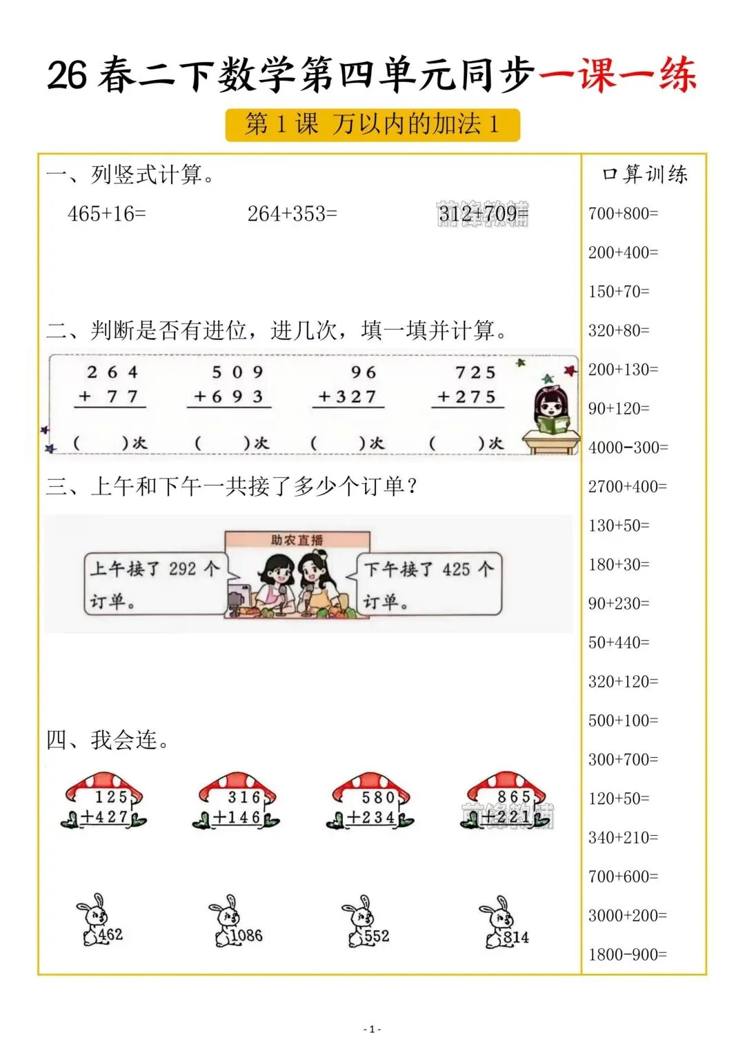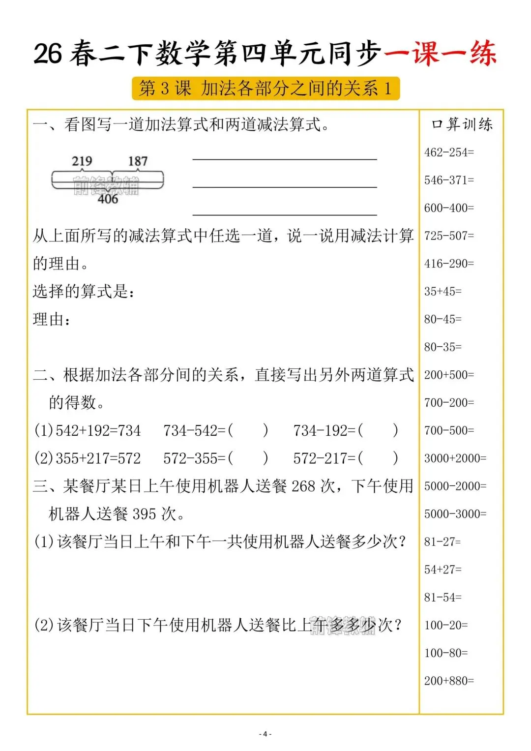 老师刚整理的!二年级下册数学第四单元一课一练(共5页)!家长看文末领取方式,给孩子领回去打印出来练习吧!