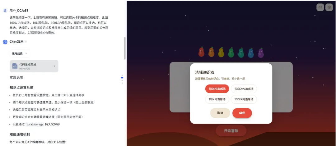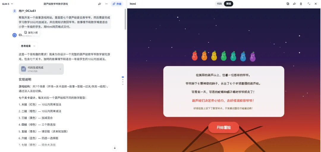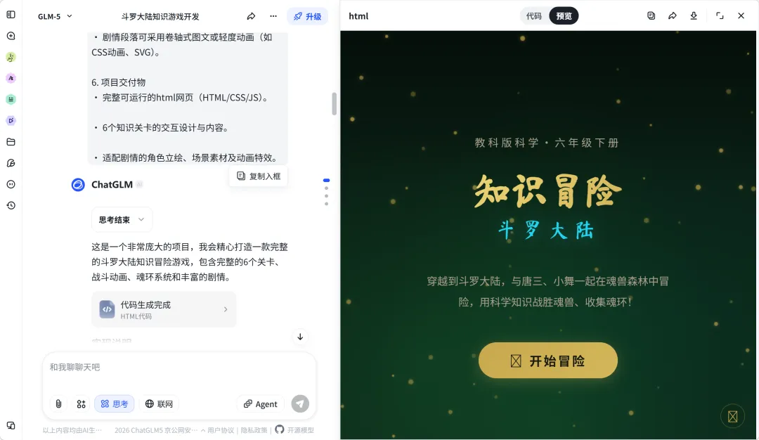 AI给了我比较完整的开发需求,我再去智谱里面开始进行编程,几分钟左右得到了预览网页。