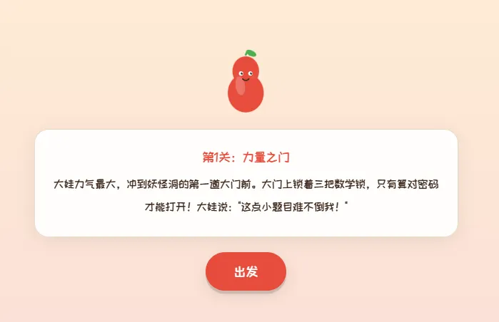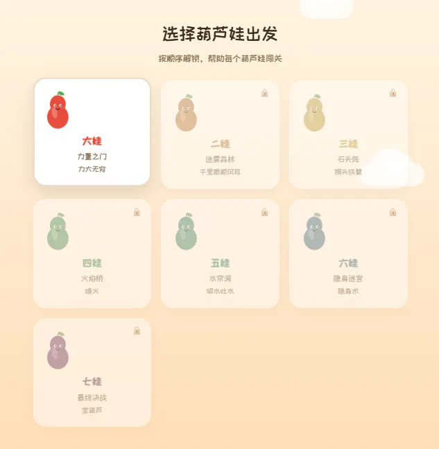 故事有了,刚好结合小学低年级数学10以内的加减法知识,然后把七个葫芦娃刚好可以做成七个关卡,答对所有题目就可以救回爷爷。