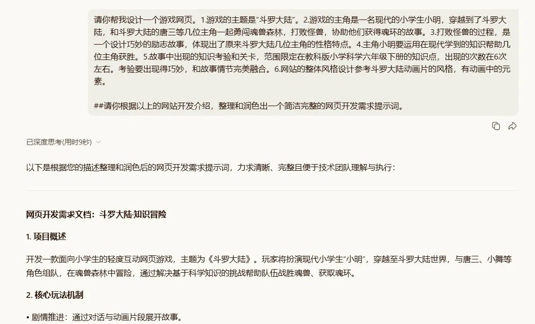 接下来就简单了,直接整理提示词,发给AI开始制作游戏网页!