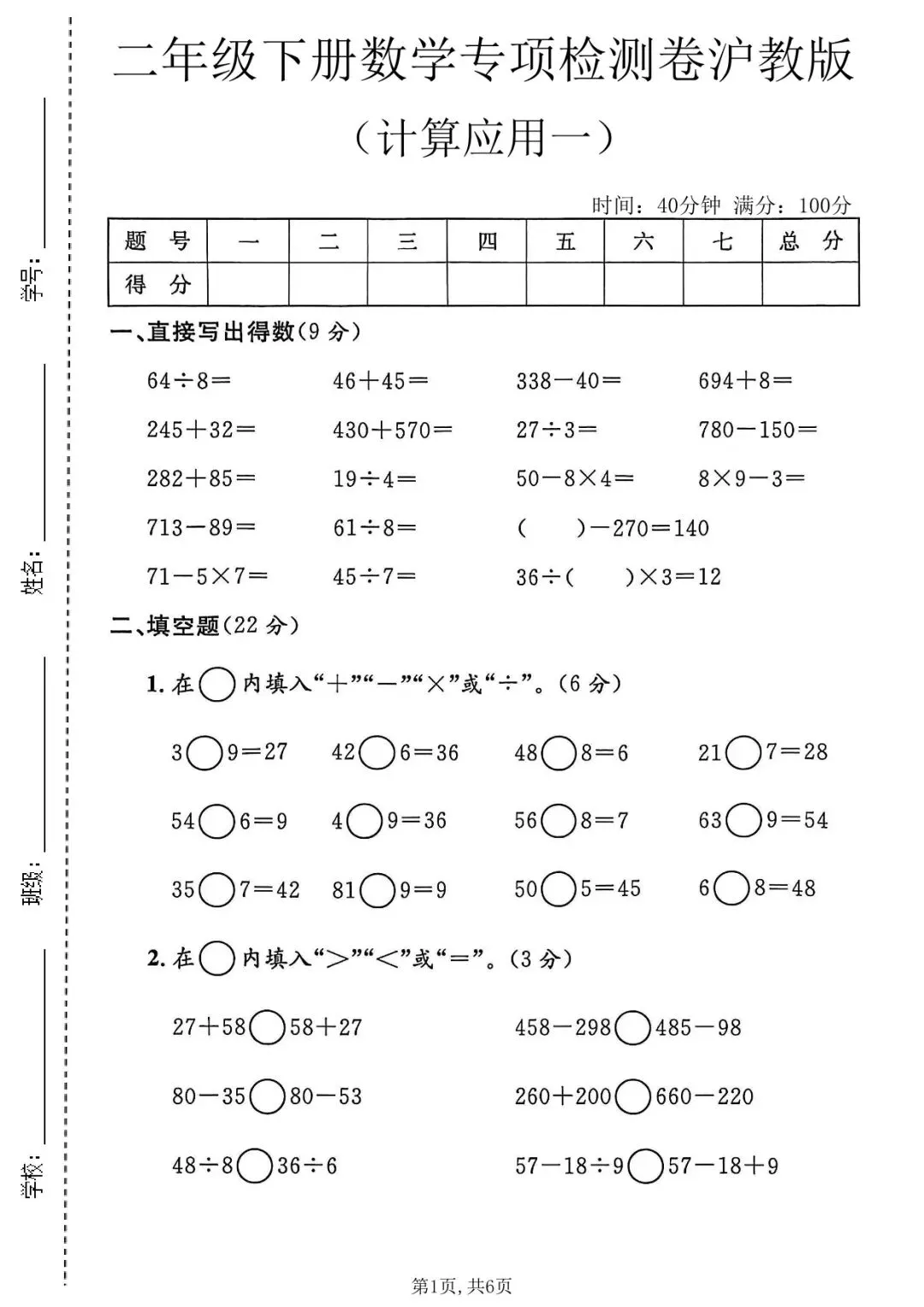 本卷为沪教版二年级下册数学计算应用专项检测卷,聚焦计算能力与应用能力专项巩固,核心覆盖表内乘法和除法、两步混合计算(含脱式)、乘加乘减、除法应用、两步应用题等期中前重点内容,题型以计算和应用题为主,贴合校内专项检测风格,侧重基础夯实、易错突破和应用能力提升,适合学生专项自查、针对性强化,熟练掌握计算方法并能灵活运用到实际问题中。
