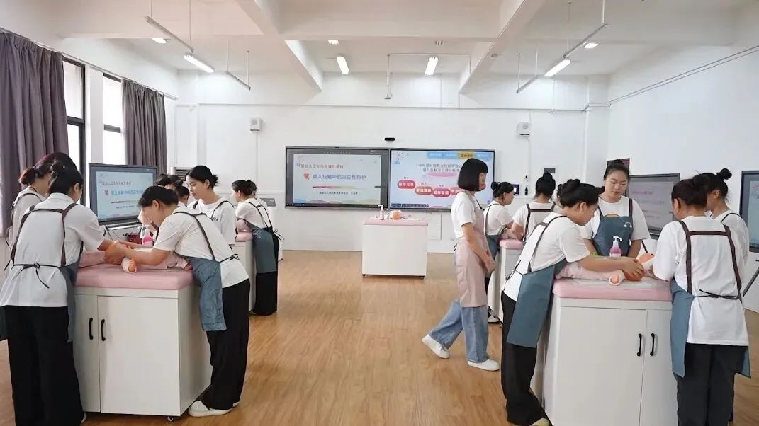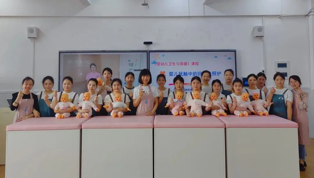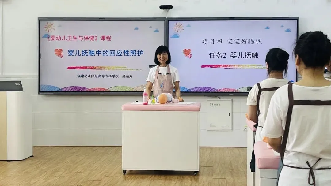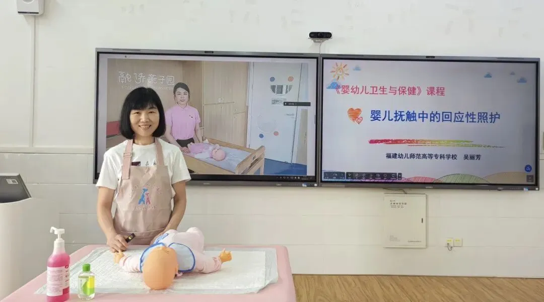 为积极响应国家“人工智能+教育”行动计划,深化产教融合、园校协同育人。2026年4月13日,我校学前教育学院《婴幼儿卫生与保健》公开课在智慧教室圆满开展。课程负责人吴丽芳教授携手优秀校友、融侨亲子园托班教学主管陈莹老师,以婴儿抚触中的回应性照护为主题,打造人工智能赋能、双师协同联动、线上线下融合的创新课堂。