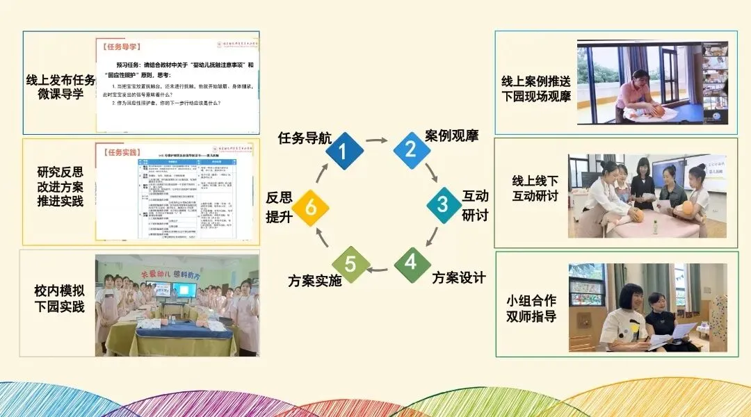 《婴幼儿卫生与保健》课程以岗位需求为导向,以托幼机构日常保健工作为主线,构建了“产出导向、学为中心、训为强基、研为驱动、创为提升”的教学模式。本次课针对学生在上一轮婴儿抚触学习中存在的情感互动不足、手法不熟练、与婴儿自然交流不够等问题,结合1+X母婴护理职业技能等级标准,采用“六环节+双境互通”线上线下混合式项目教学法,围绕任务导航、案例观摩、互动研讨、方案设计、方案实施、反思提升六个环节形成闭环推进:课前线上发布任务并推送微课导学;课中引入真实案例,组织线上线下互动研讨,小组在双师指导下完成方案设计与模拟演练;课后开展园所实践与反思改进,并以新问题引导下一项目。全过程闭环递进,真正实现以学为本、学做一体。