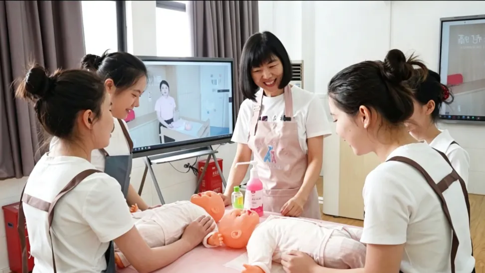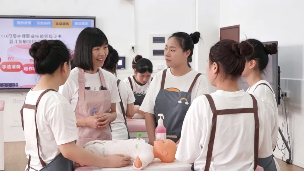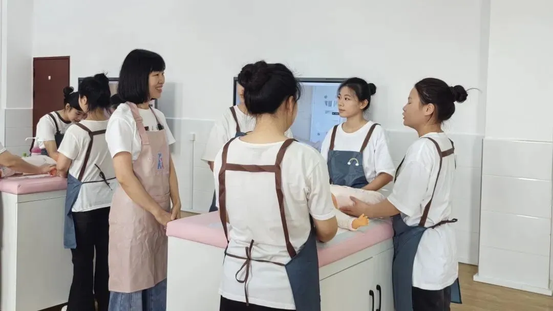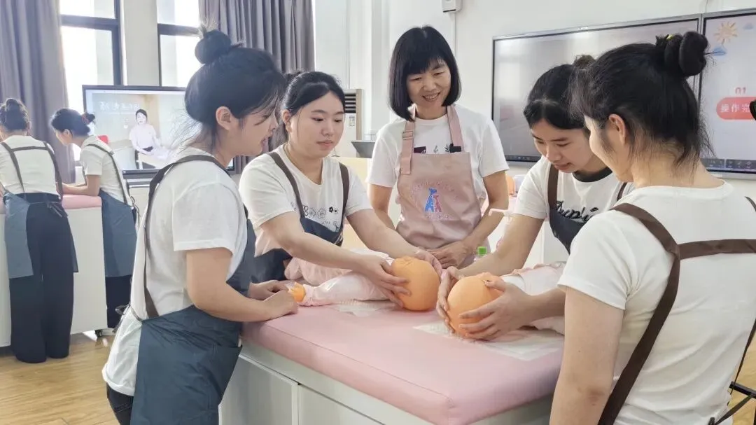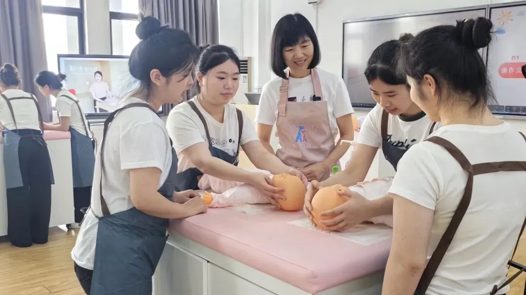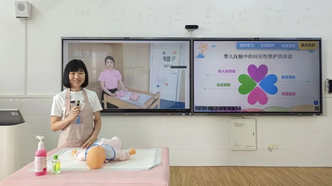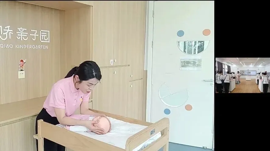 本课程构建了“校内专家+行业能手”的双师共育模式,着力提升学生的岗位实践与创新能力。以本次课为例,课前,吴丽芳教授针对学生前期学习中存在的问题,紧扣真实岗位任务,深入剖析婴儿抚触中回应性照护的核心内涵,梳理出“拟人化对话、察言观色、动态调整、用爱回应”四步法。课中,吴丽芳教授携手陈莹老师共同指导学生开展项目实训,陈莹老师依托一线实战经验,通过线上连麦开展专业示范,将岗位实操技能与情感育人要求有机融合;同时组织小组研讨,引导学生运用四步法进行方案设计与实操演练,为课堂注入鲜活的行业实践力量。
