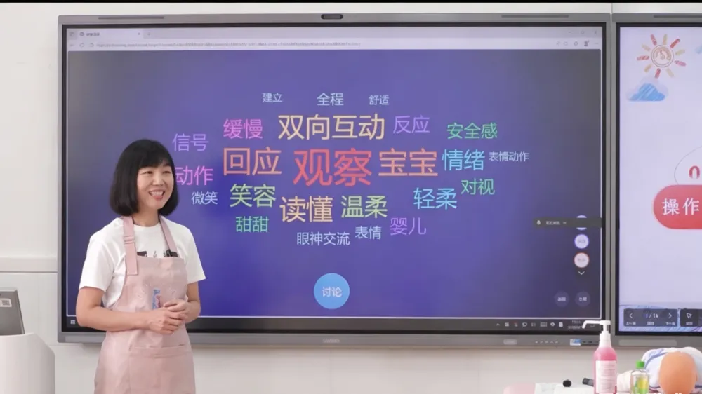 陈莹老师凭借十余年托育一线经验,在线上示范中以温柔互动、即时观察、动态调整践行照护准则,将婴儿抚触回应性照护的每一个细节演绎得温暖而有情感。吴丽芳教授基于陈莹老师的精彩示范,梳理总结出“手要轻、嘴要甜、眼要笑、动作慢”的照护口诀,为学生提供了易于理解、便于记忆的学习抓手,切实提升了学习效果。
