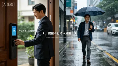 手指刚触碰到门锁,内屏亮起——“今日有雨,记得带伞”你瞥了一眼,顺手拿了把伞。出门后果然下雨了。