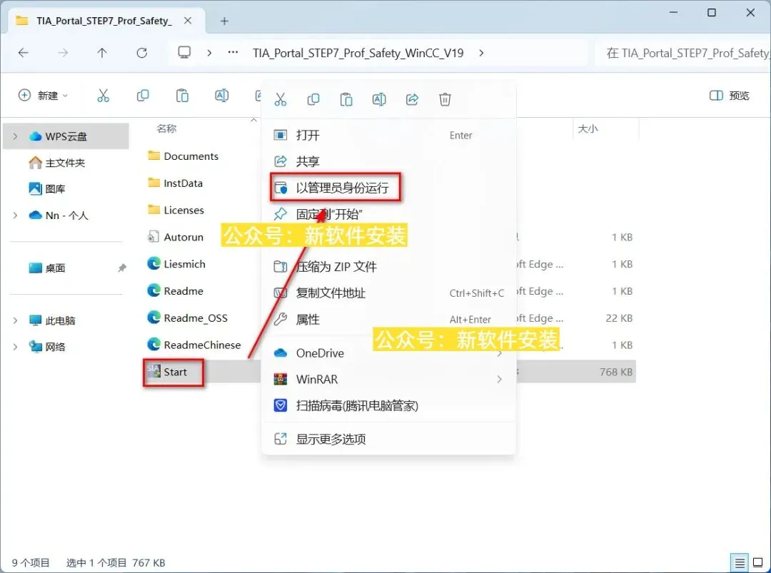 17.打开【步骤1】中,安装包解压后的【TIA portal V19 (64bit)】文件夹,鼠标右键【NoRestart】选择【以管理员身份运行】。