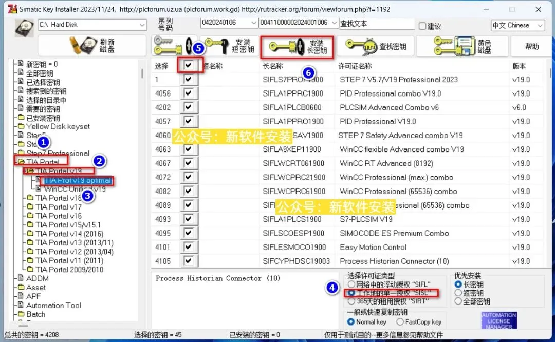 29.①双击【TIA Portal】;②双击【TIA PortalV19】;③选中【TIA PortalV19 optimal】;④选择【工作地的单一授权】;⑤勾选短名称前的【勾选框】全选产品;⑥点击【安装长密钥】。
