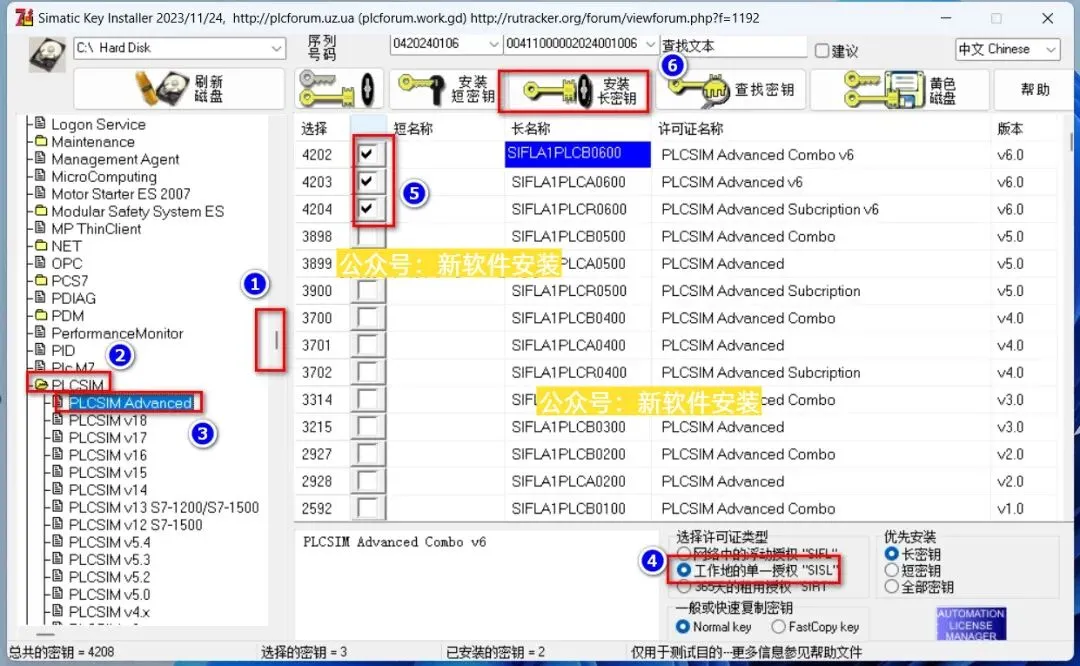 31.①滑动【下拉】按钮找到【PLCSM】;②双击【PLCSM】;③选中【PLCSM Advanced】;④选择【工作地的单一授权】;⑤勾选【4202、4203、4204】;⑥点击【安装长密钥】。